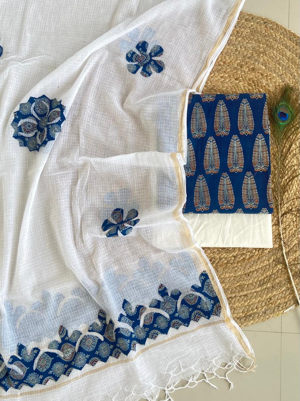 The blue pines motifs are very rare. The Dupatta is cotton with applique work and kantha work as well. Pure cotton suit pieces. Top 2.5 metres, bottom 2.5 metres and Dupatta 2 metres. The Dupatta is kota with applique patchwork done by hand and therefore the dupattas look pretty. Colours may bleed as vegetable colors. Therefore wash separately and in cold water.