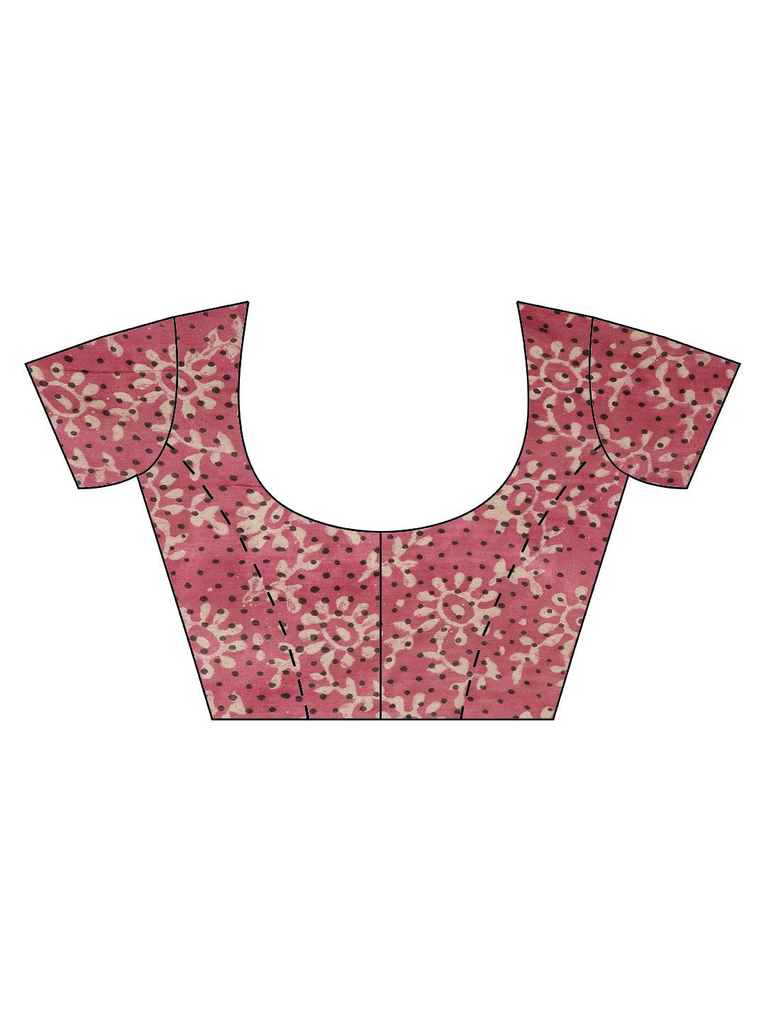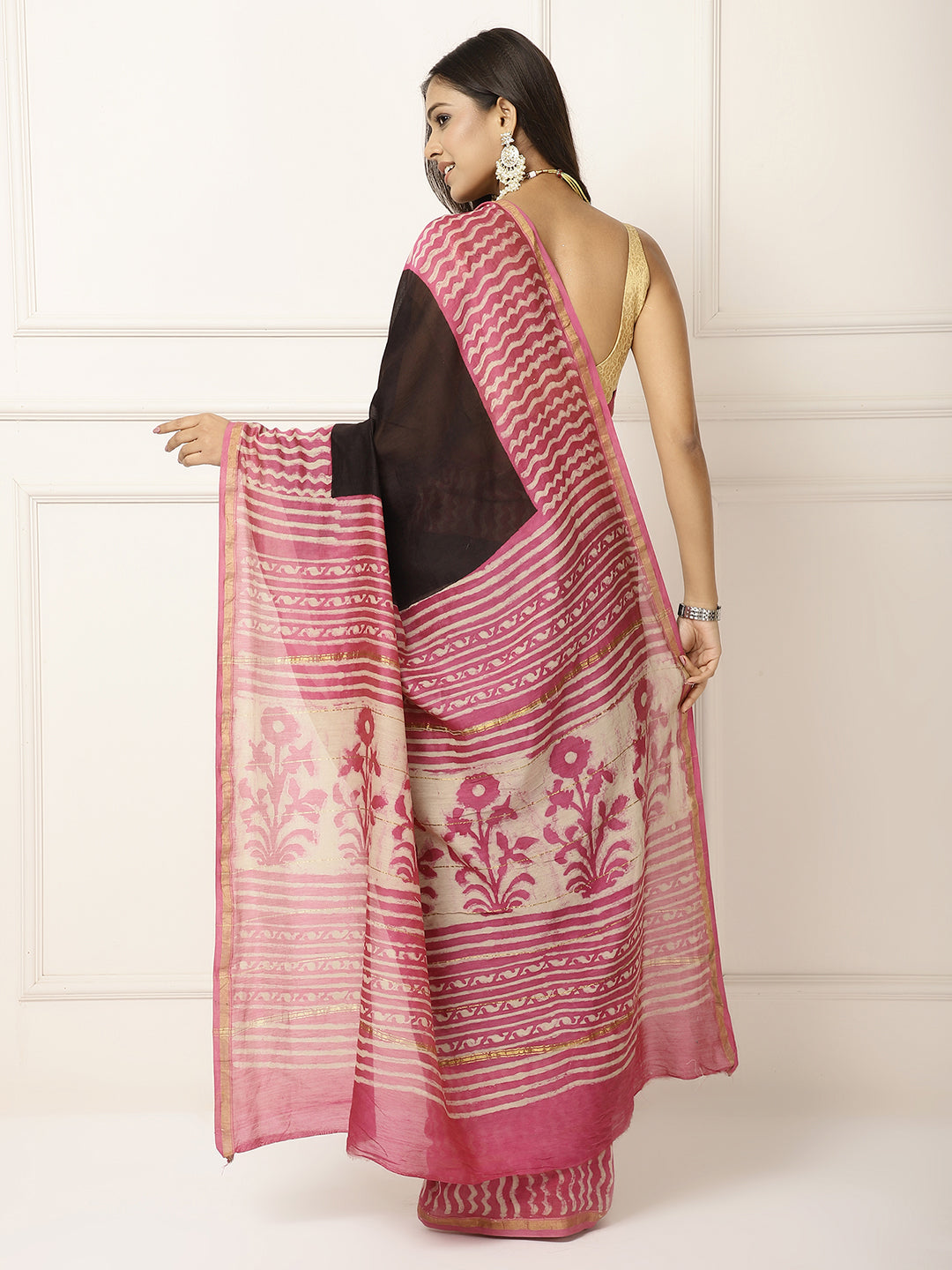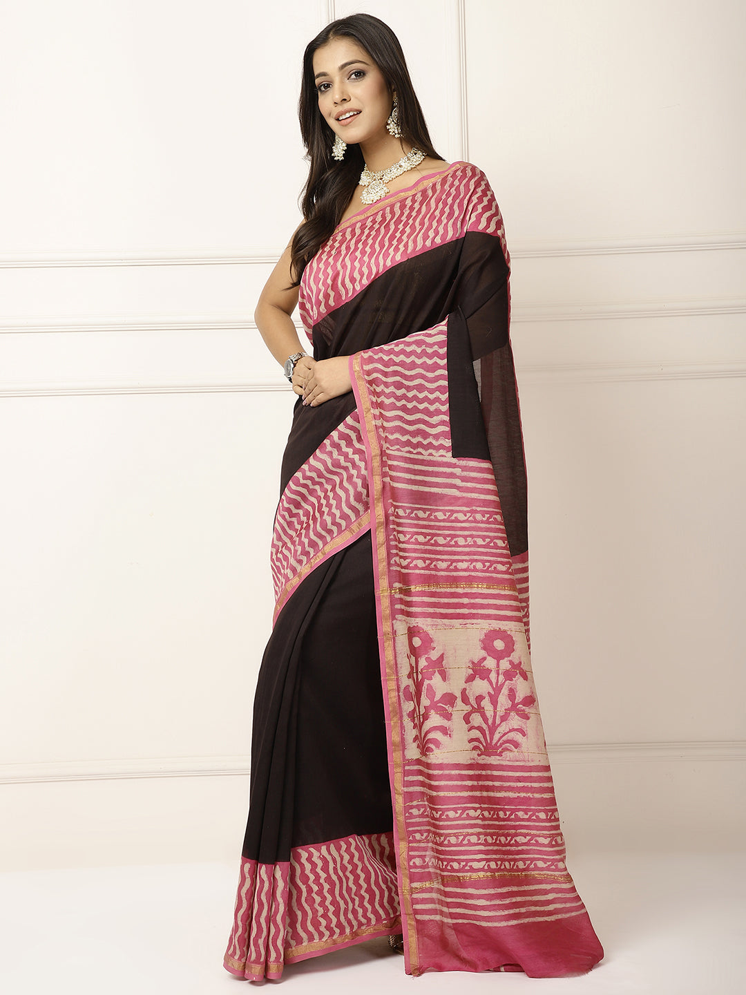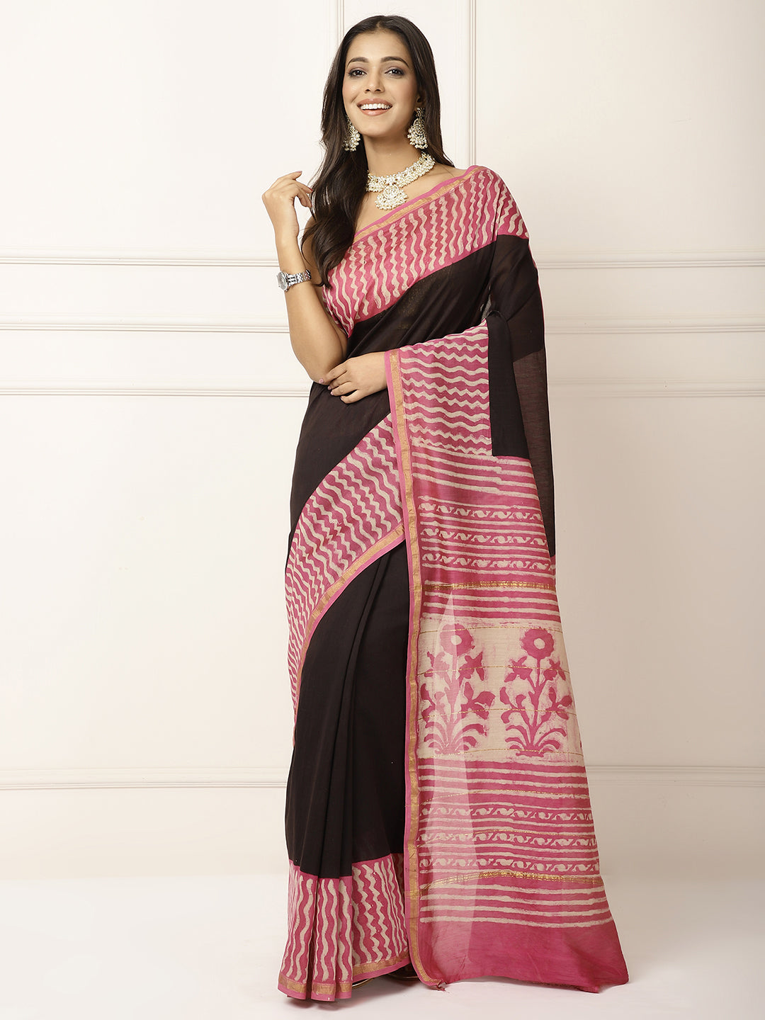 Chanderi saree with a Black body and pink handblocked border. These are perfect for office wear and the blouse piece also is pink with tiny black dots. The saree with blouse of 6.3 metres.