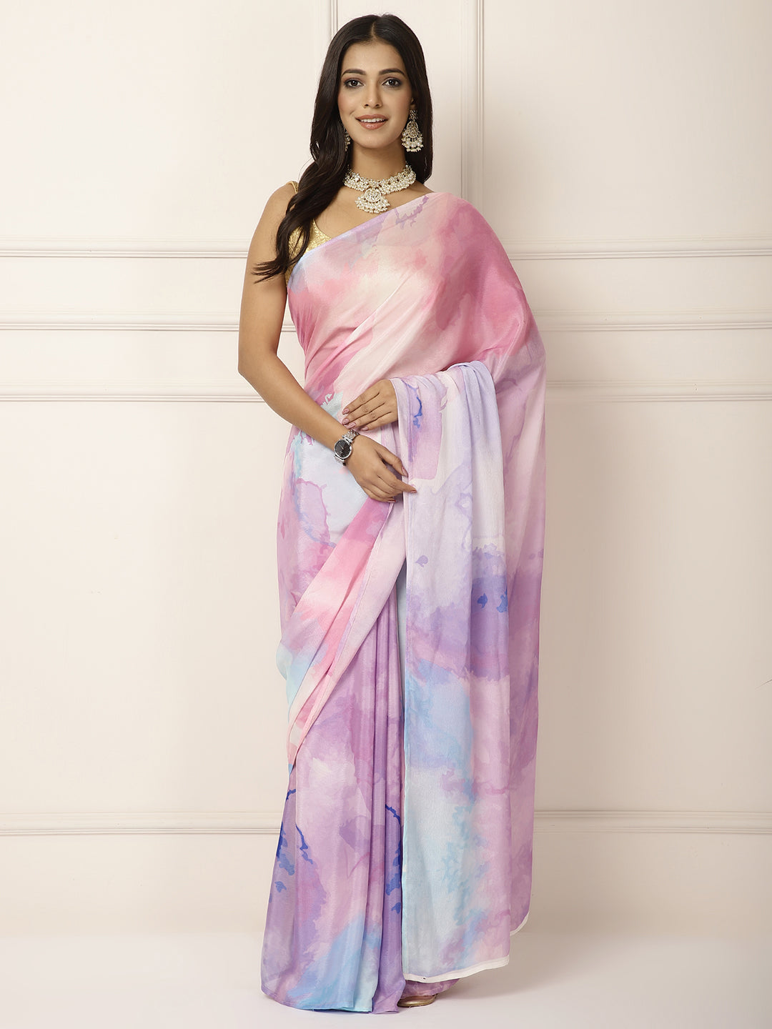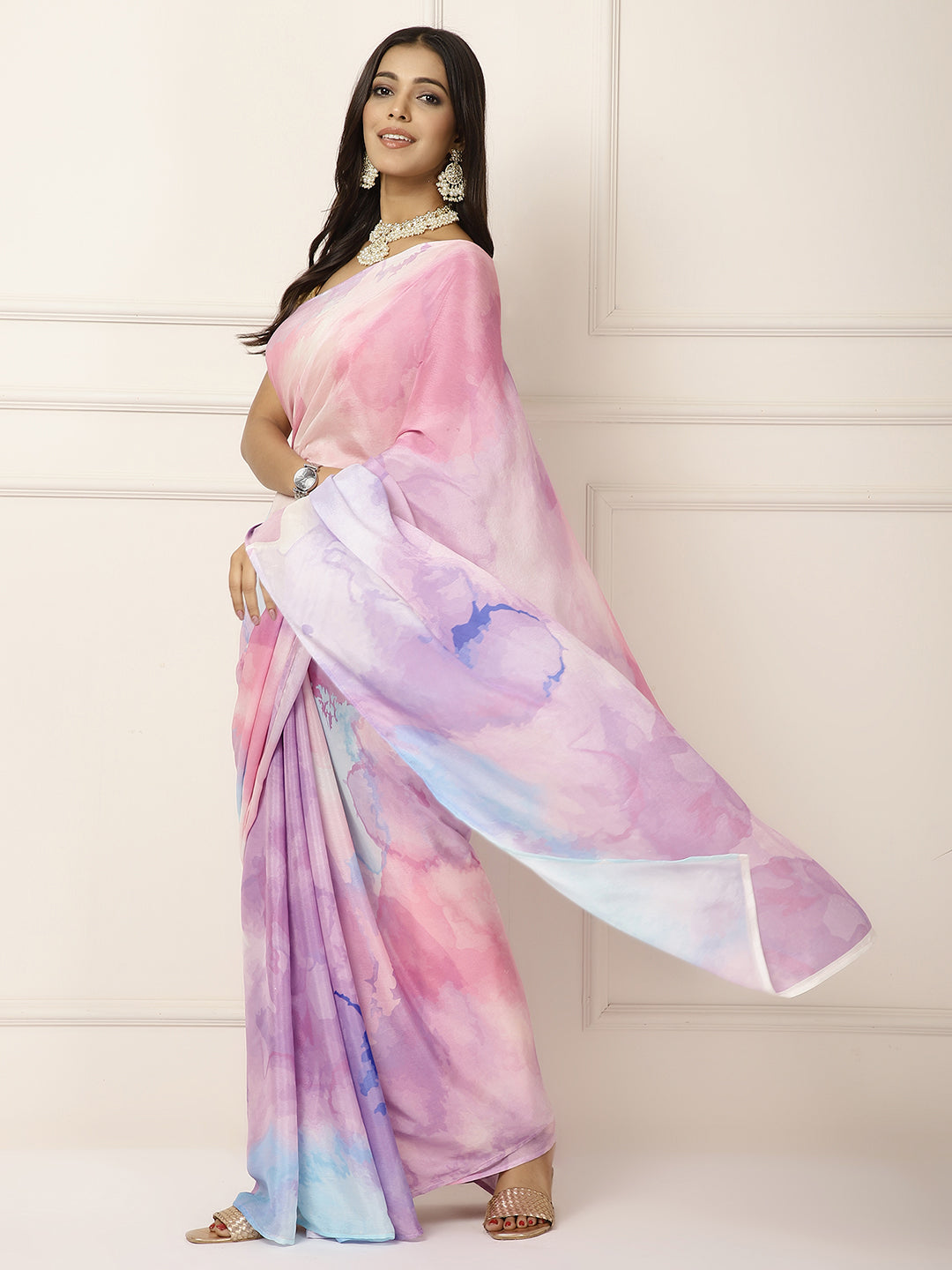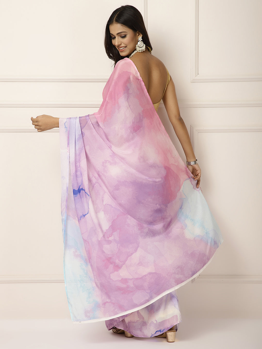 Hues of Blue and purple water colour effect with a blouse piece which has eye peeking out at the back (Material Georgette Crepe Length 5.3 meter and blouse piece 1 meter)