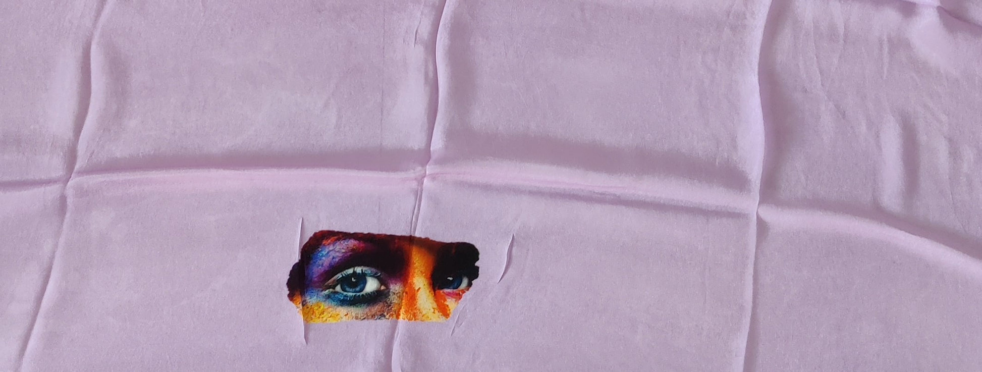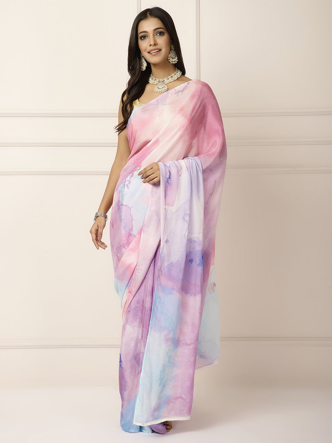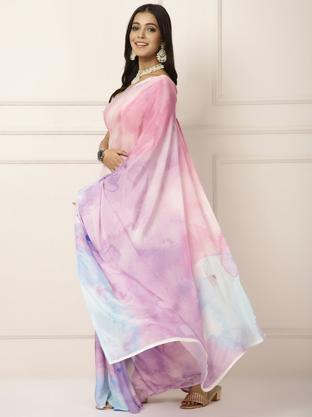 Hues of Blue and purple water colour effect with a blouse piece which has eye peeking out at the back (Material Georgette Crepe Length 5.3 meter and blouse piece 1 meter)