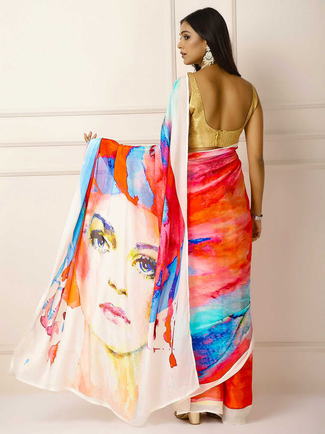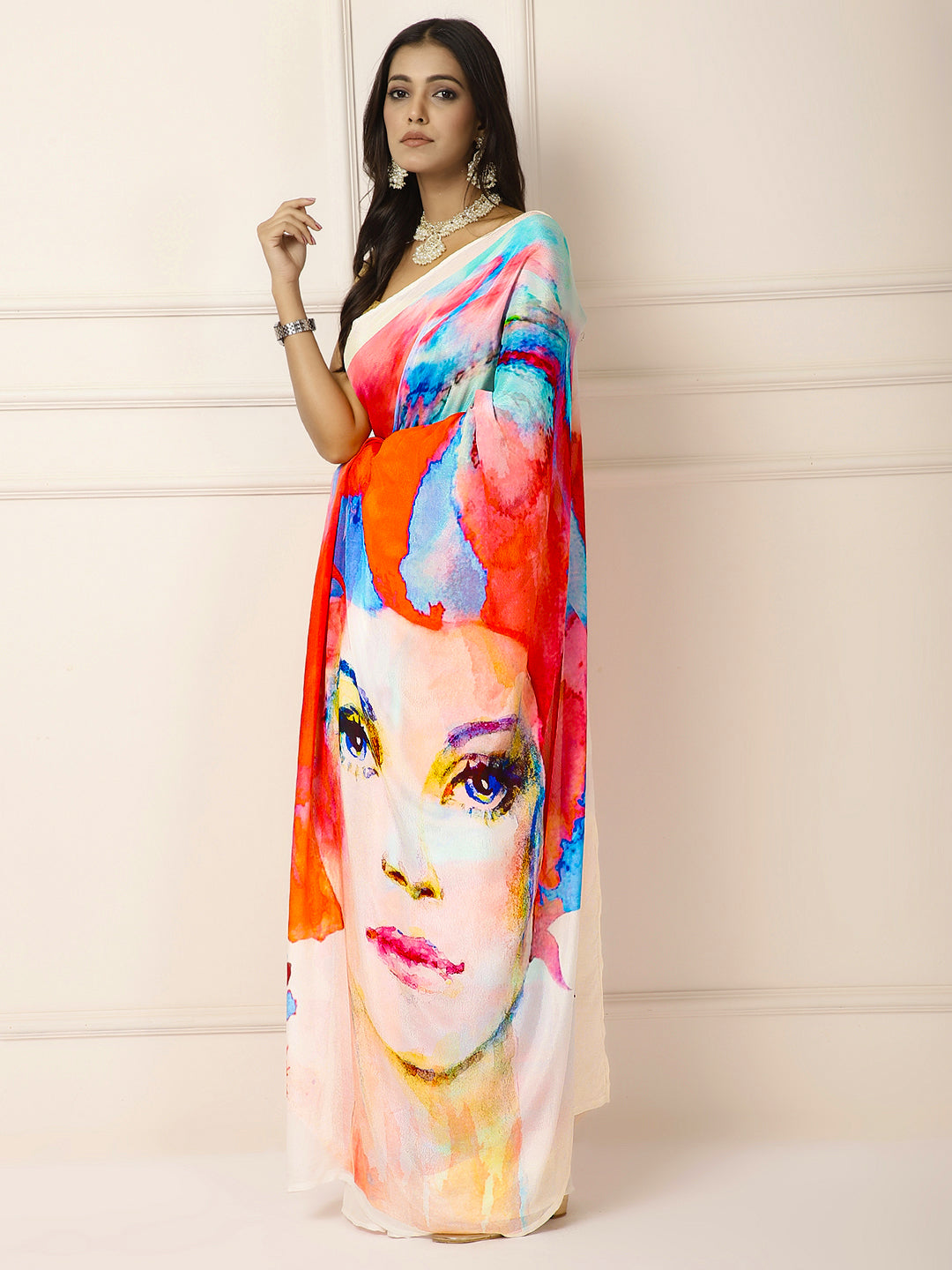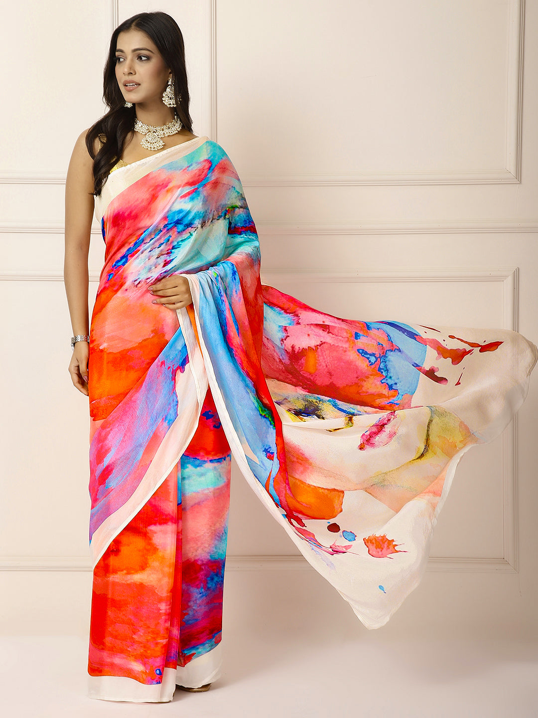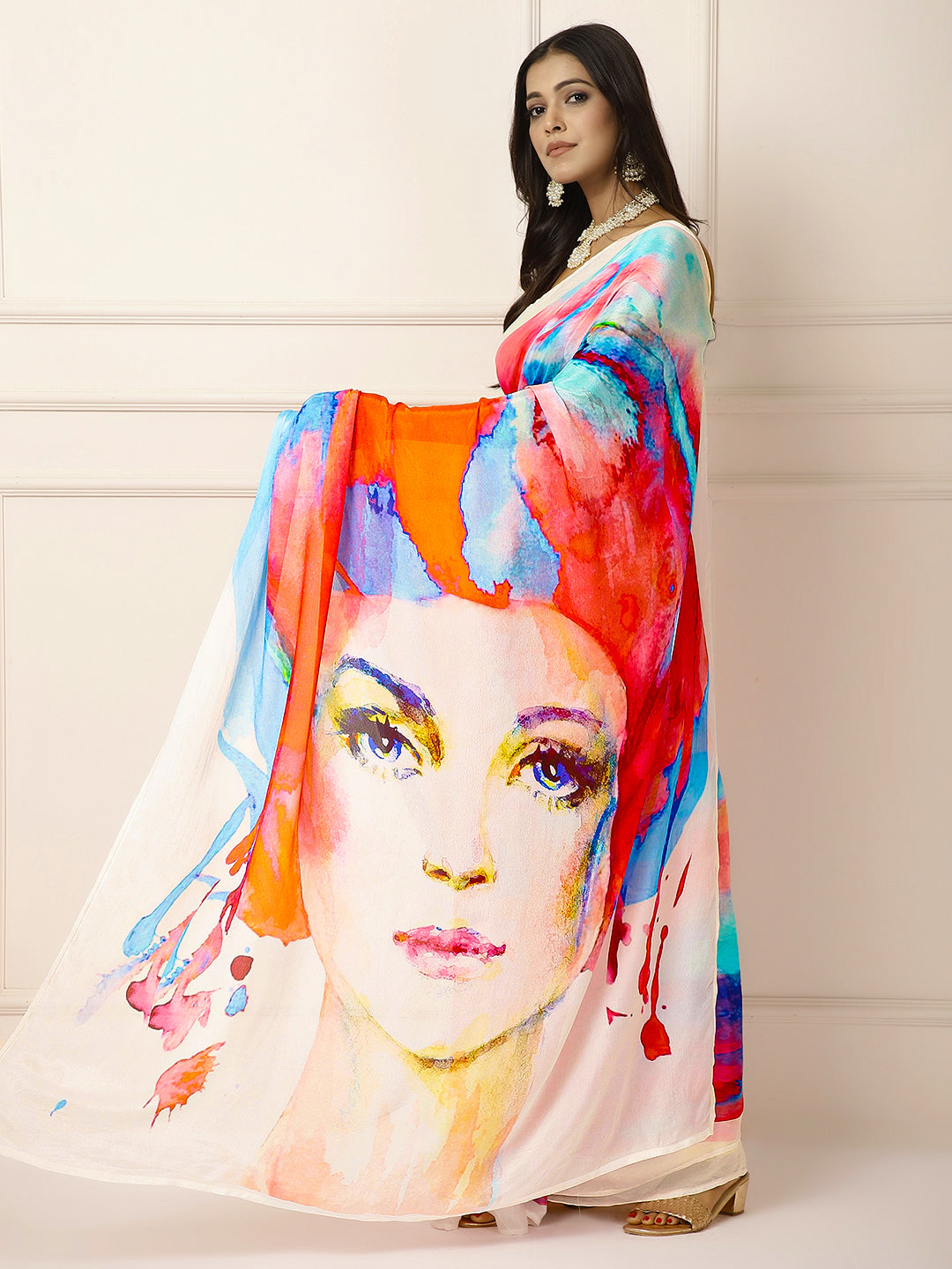 This saree depicts the many colours in a woman's mind. It is called the Colours of a Woman's mind. Wear it with any blouse to change the look. Georgette Crepe 5.3 metres.