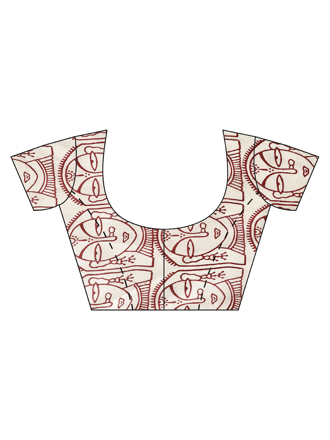 The saree is on 3 Ply Murshidabad silk. The Saree has a unique designer piece. The border is designed with figures which are inspired by creations of Jamini Roy. The blouse piece is also very unique and accentuates the beauty of the saree. The saree is 6.3 metres inclusive of the blouse.