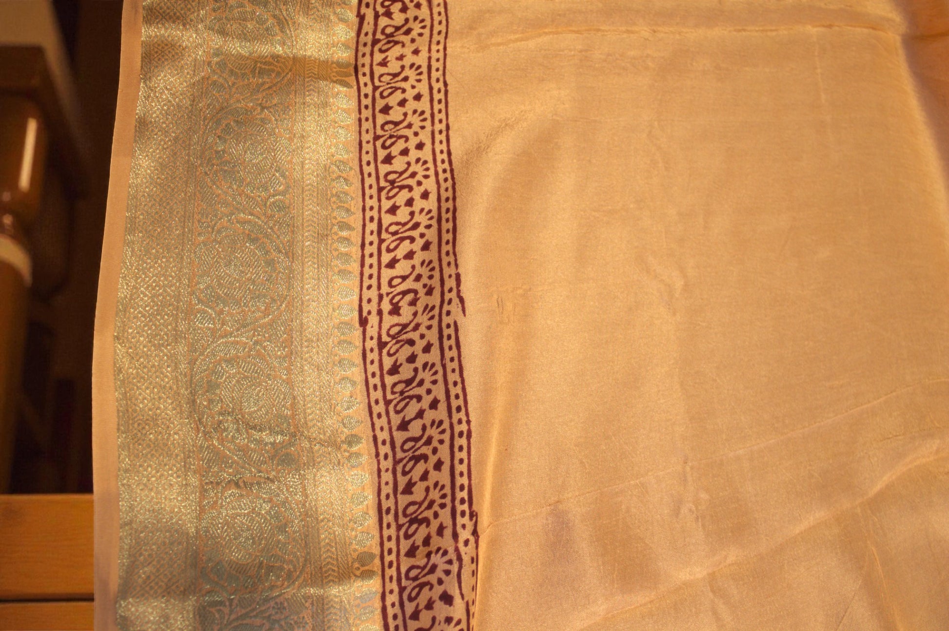 The saree is a beige coloured Dola Silk saree. It has pretty handblocked motifs all along with a beautiful pallu. The border is in Gold Zari and gives a royal look to the saree. The material is such that the fall is soft and flowing. The saree is 6.3 metres and comes with a blouse piece.
