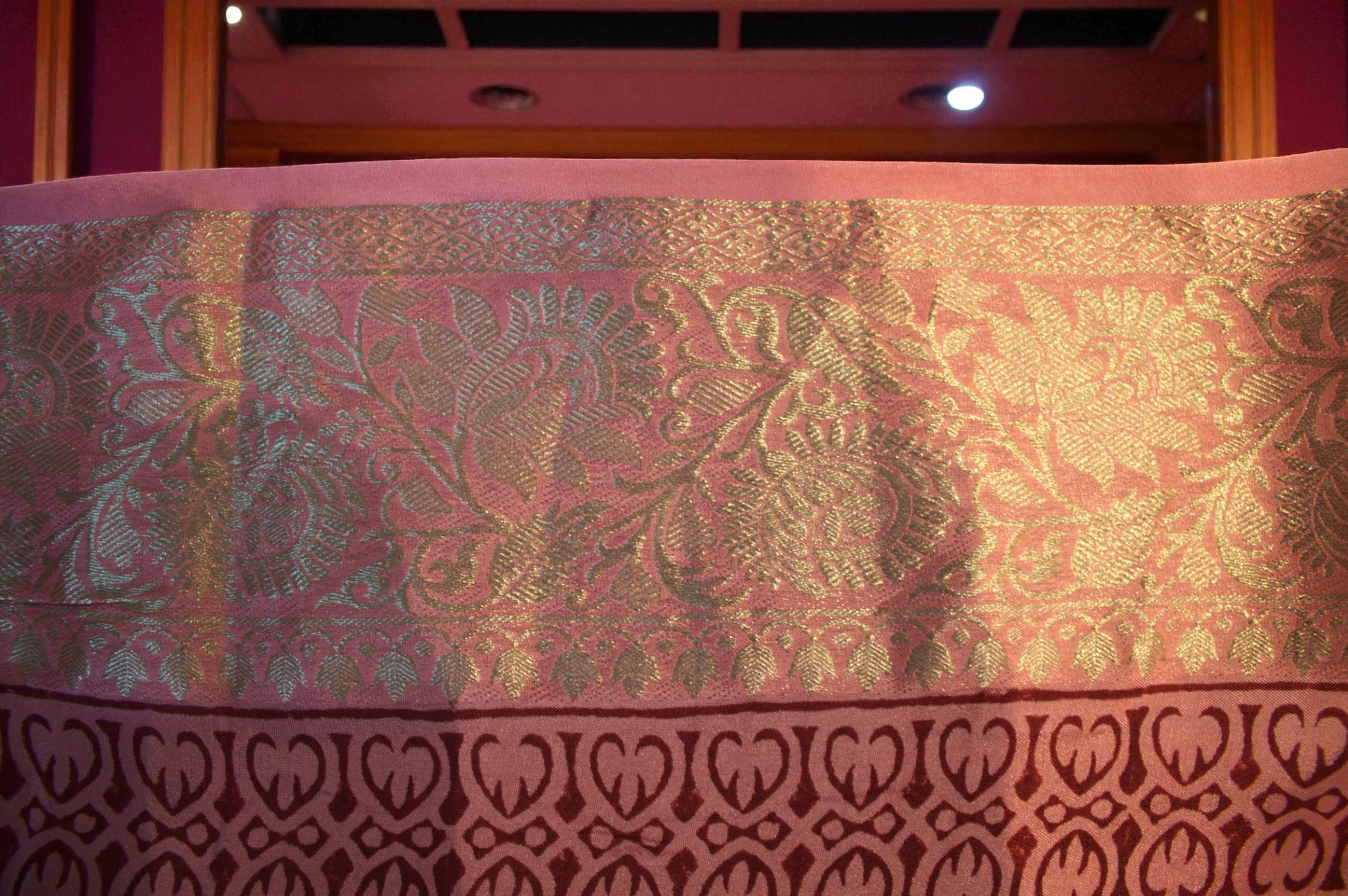 The saree is a pink coloured Dola Silk saree. It has pretty handblocked motifs all along with a beautiful pallu. The border is in Gold Zari and gives a royal look to the saree. The material is such that the fall is soft and flowing. The saree is 6.3 metres and comes with a blouse piece.