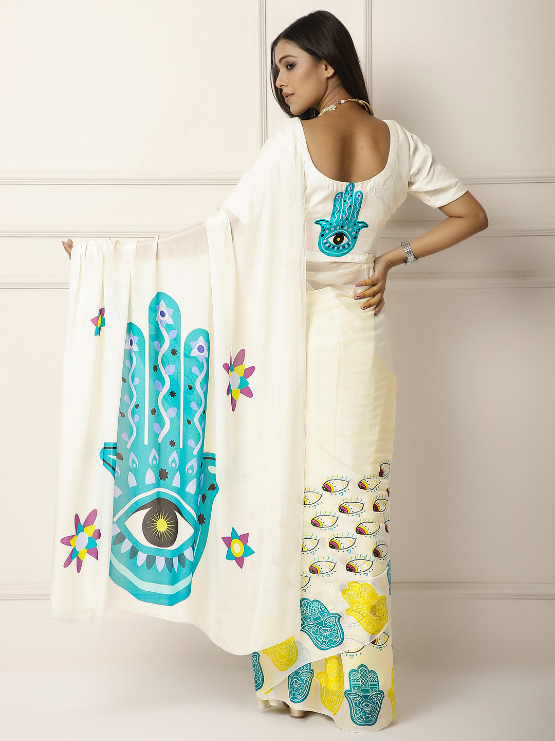 A pink evil eye symbolizes protection and contentment in your love life. It can be hard to open yourself up to love and all the trials and tribulations that can come with it. The pink evil eye is thought to keep you safe from difficult relationships that leave you feeling drained, and instead, brings in healthy relationships that leave you feeling fulfilled. This saree embodies the pink evil eye to make you safe from all difficulties in your relationship ( Material Georgette Crepe Length 5.3 meter)