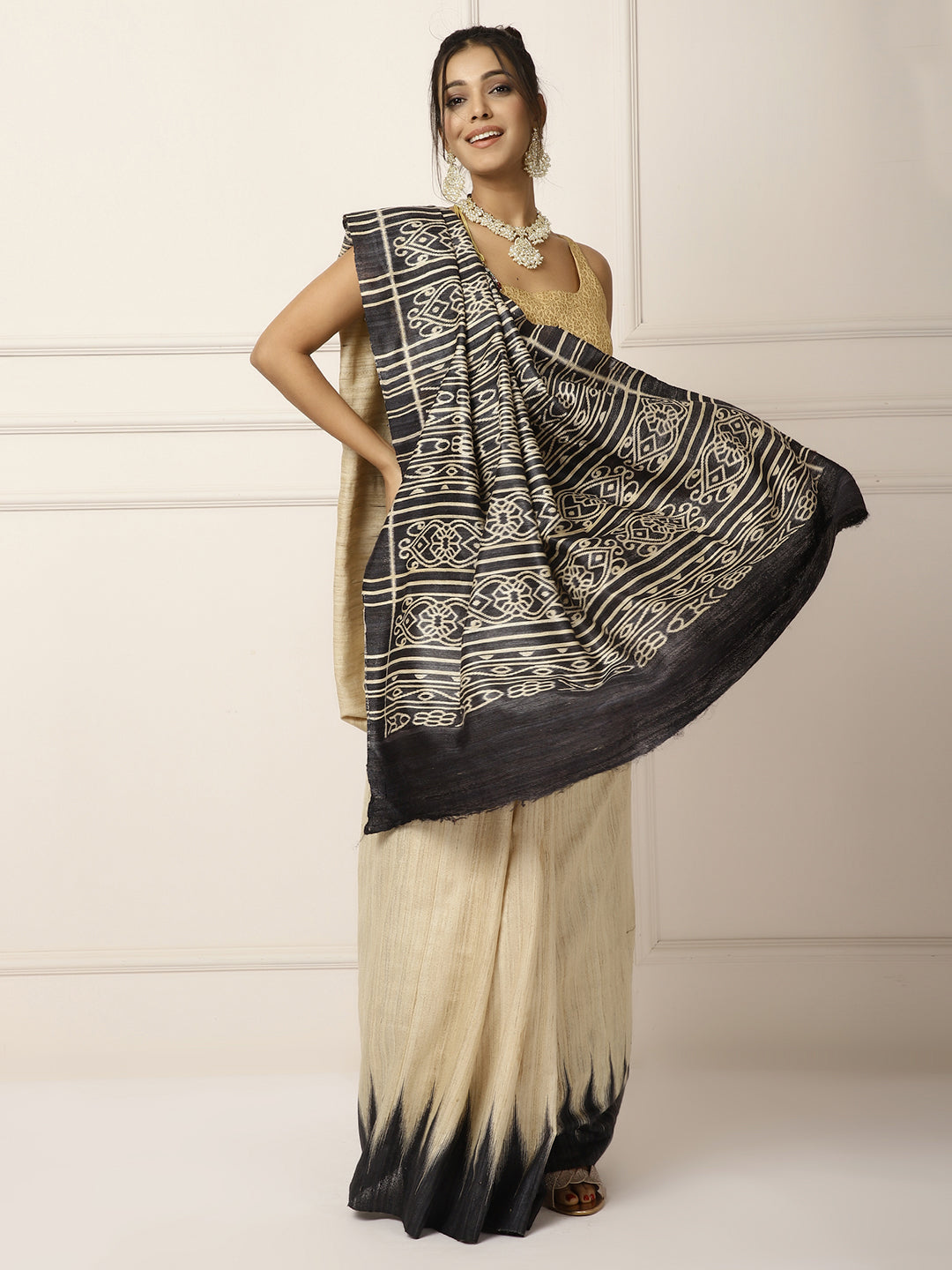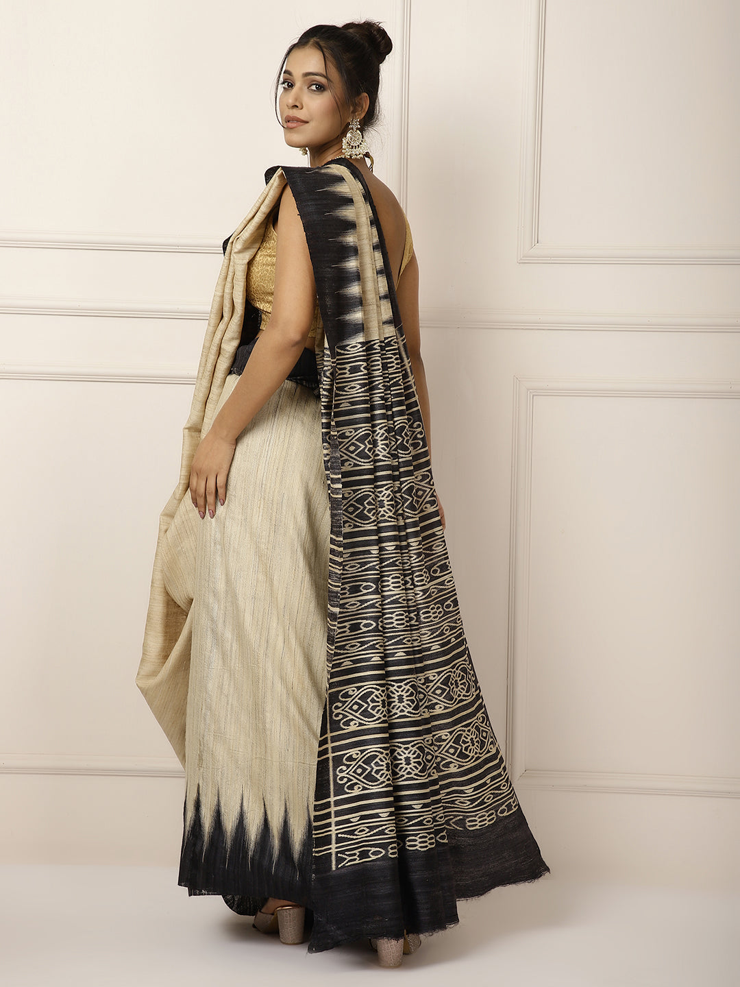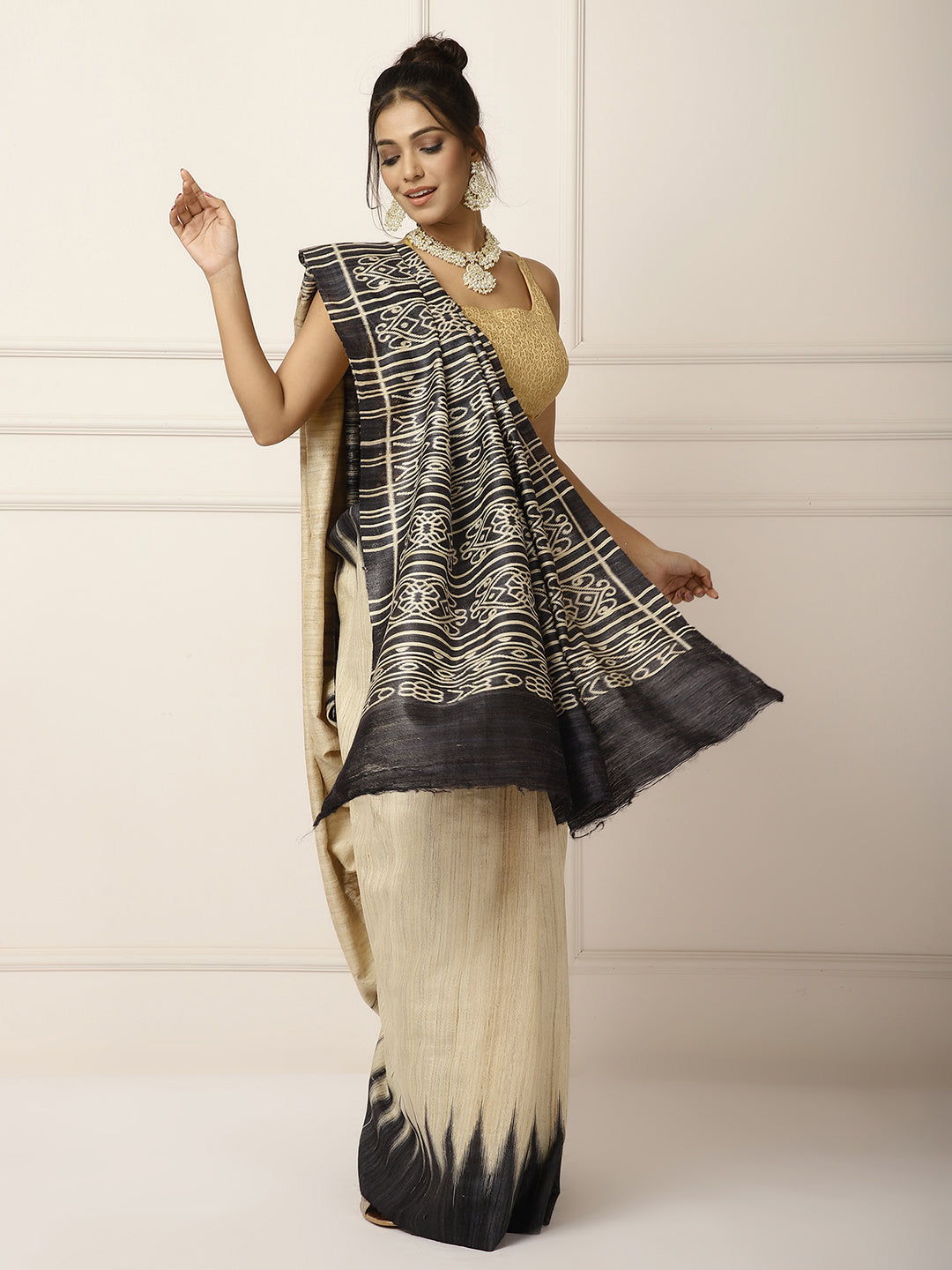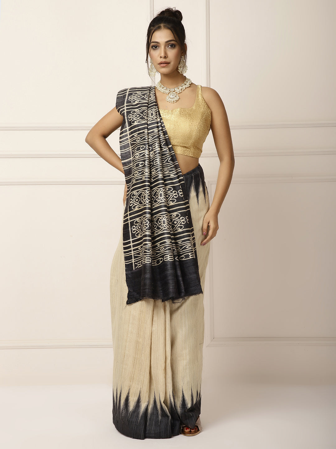 This saree is a very classy saree with tussar and ghicha weave. It has black temples in the anchal and the border makes it a very formal drape. The material is pure ghicha silk. The saree comes with a blouse piece. Saree length is 6.3 metres inclusive of blouse. The blouse on the model is not indicative of the blouse piece.