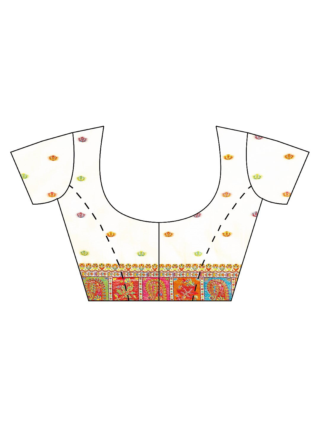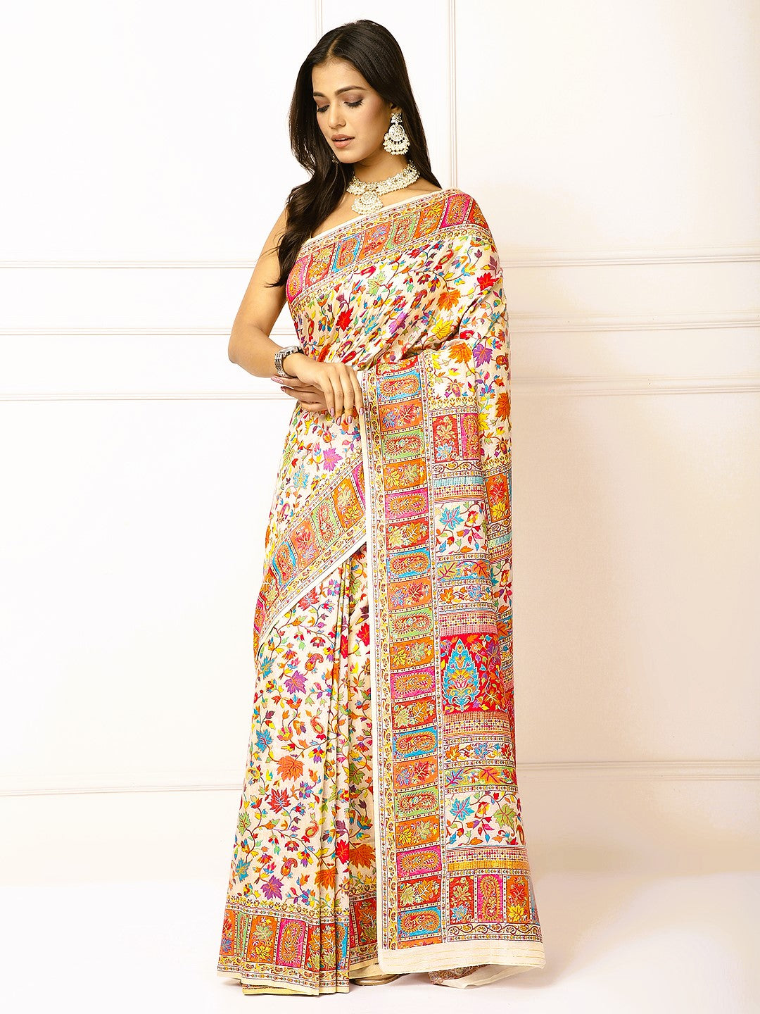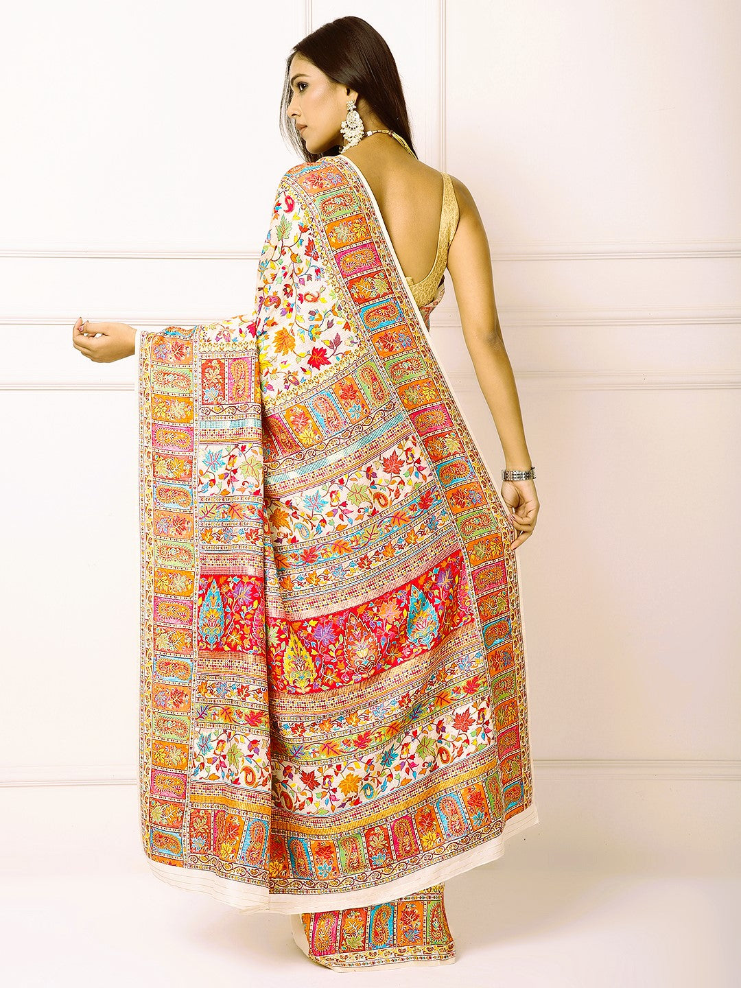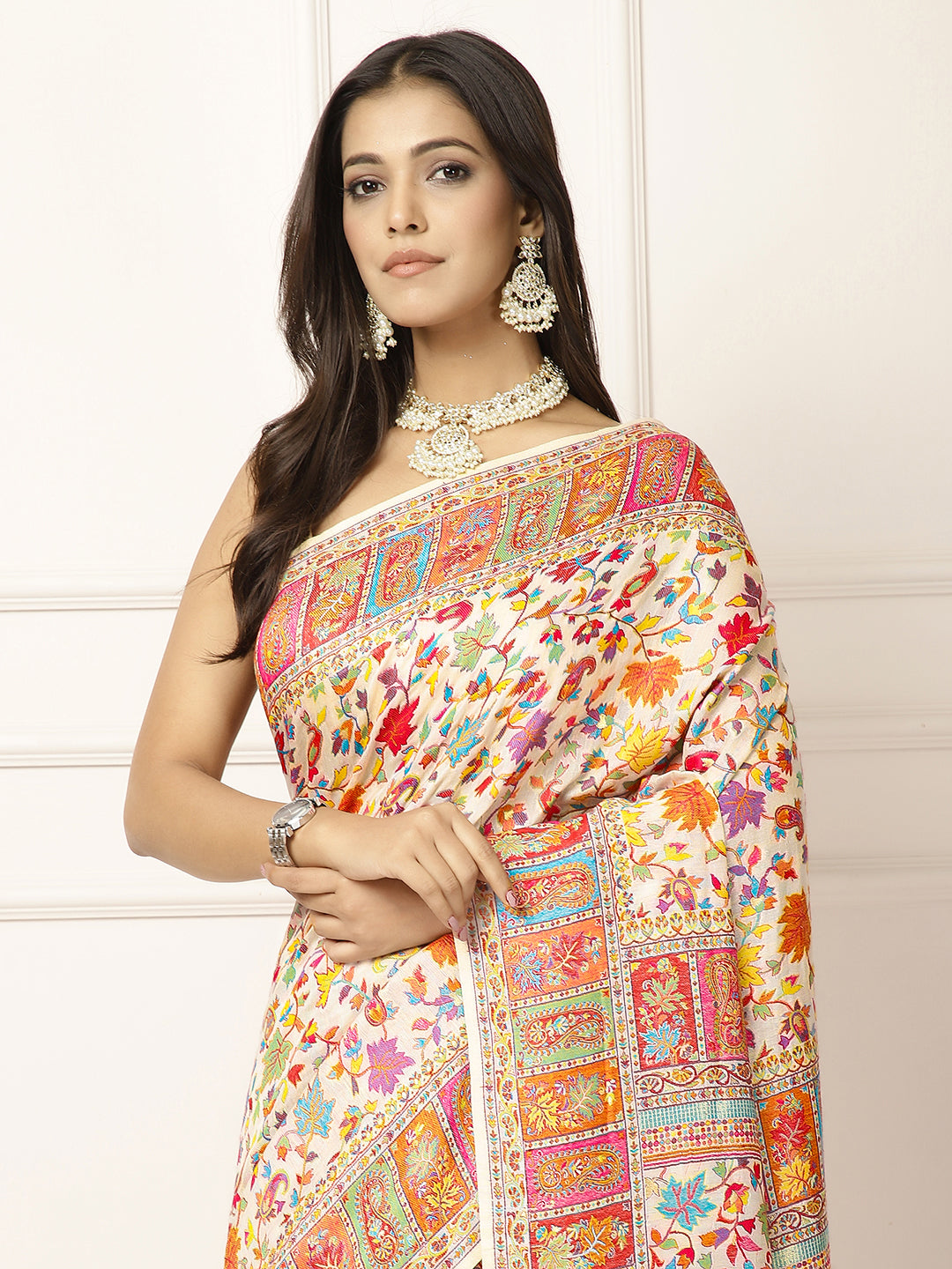 Kaani means embroidery done with wooden needles. Beautiful Kaani saree with work all over the saree. The scene is that of the various flora and fauna of Kashmir. The saree is entirely woven in cotton silk but it makes a warm wear. The blouse piece comes with a border. The saree is 6.3 meters.