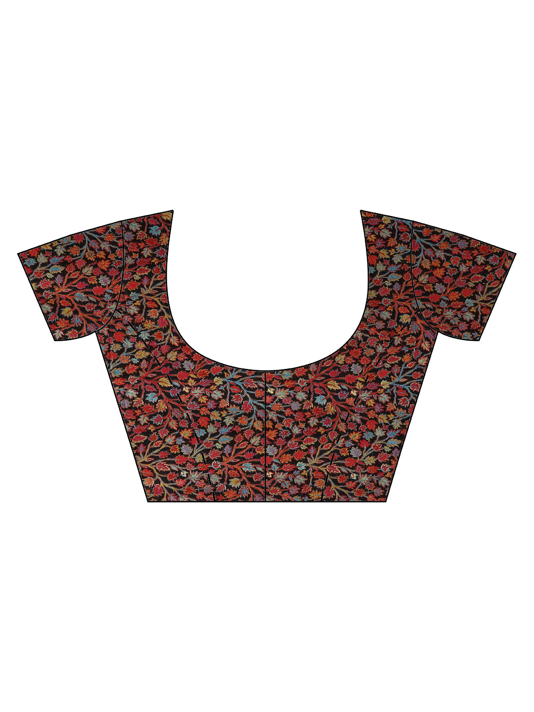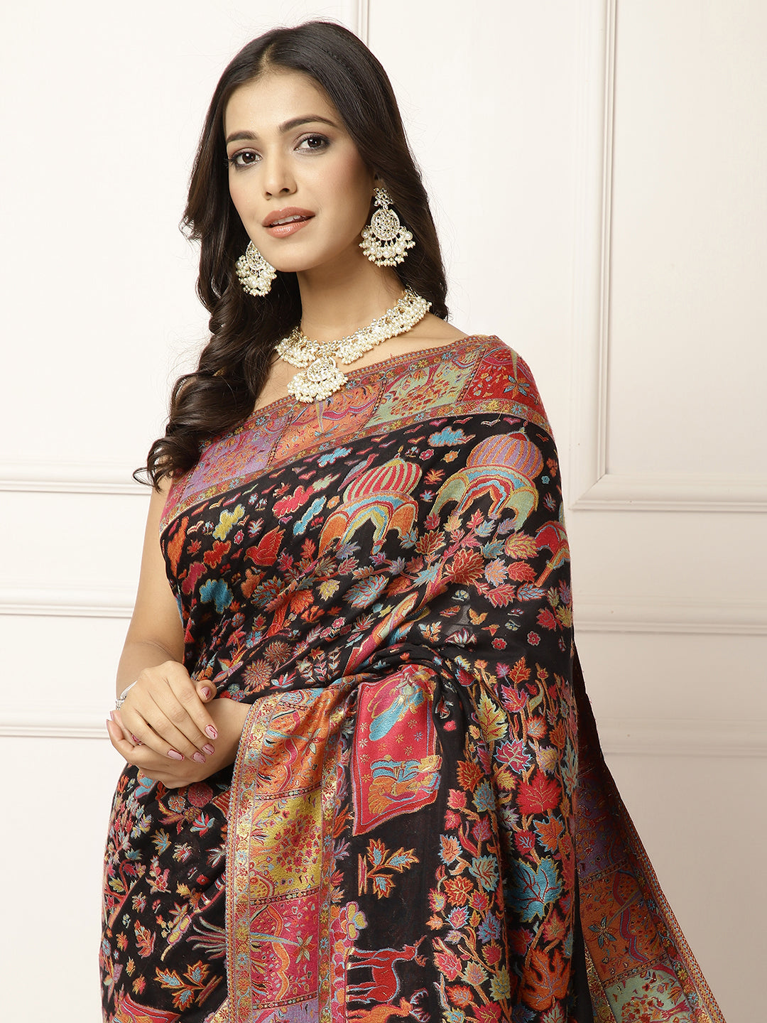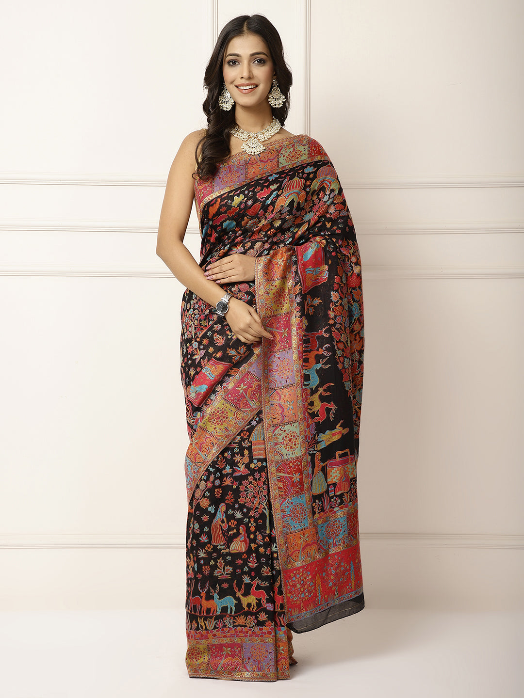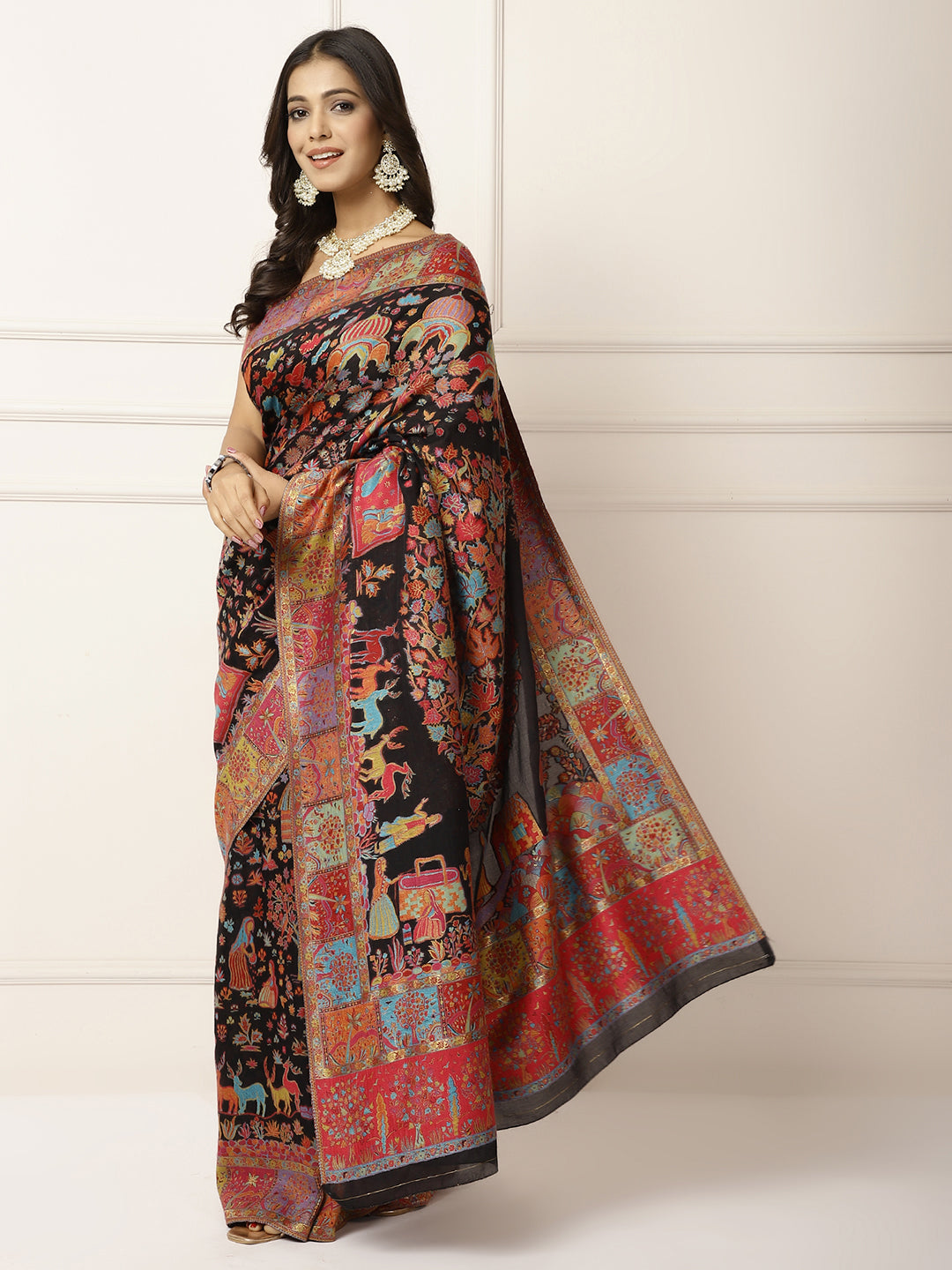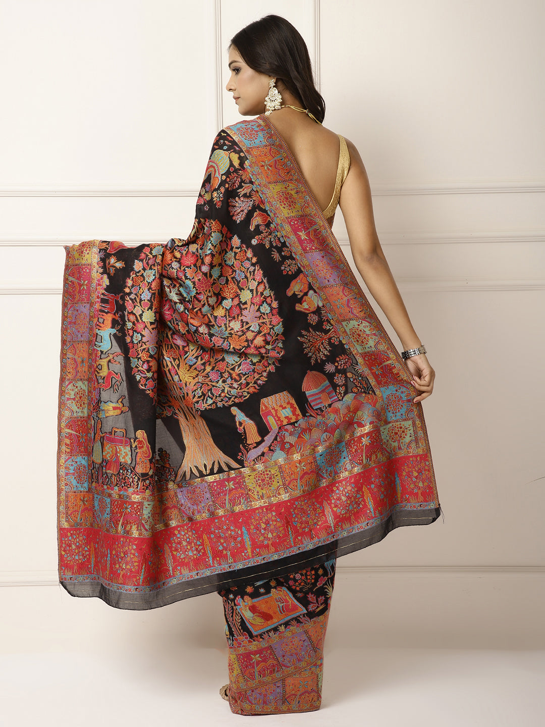 Kaani means embroidery done with wooden needles. Beautiful Kaani saree with work all over the saree. The scene depicts the village scene and shows that the tree of life is the source of all life form. The saree is entirely woven in cotton silk but it makes a warm wear. The blouse piece comes with a border. The saree is 6.3 meters.