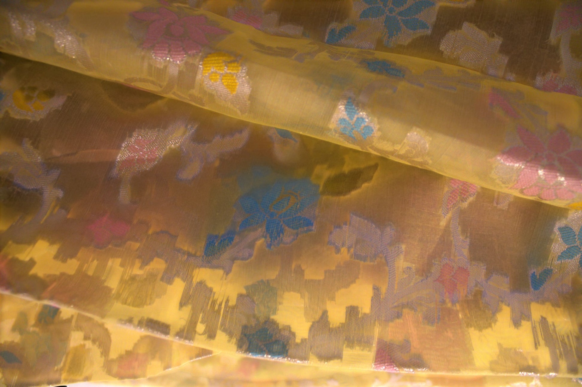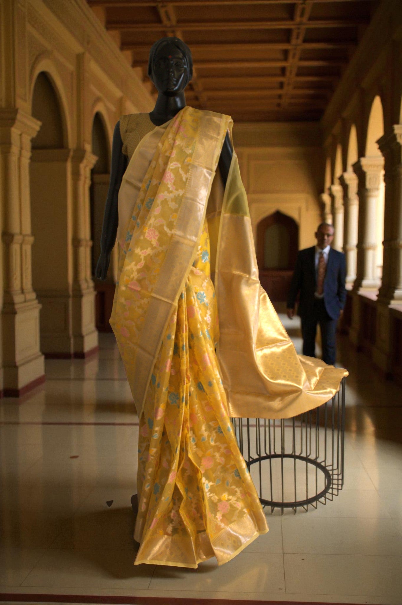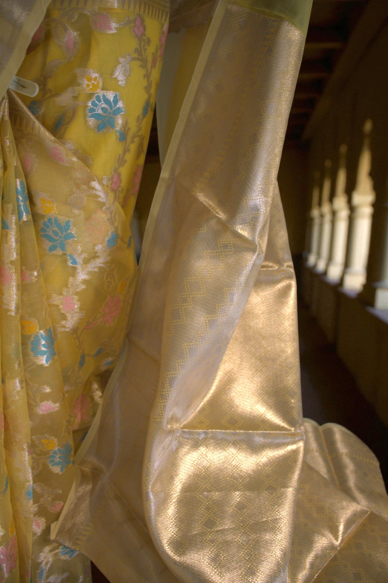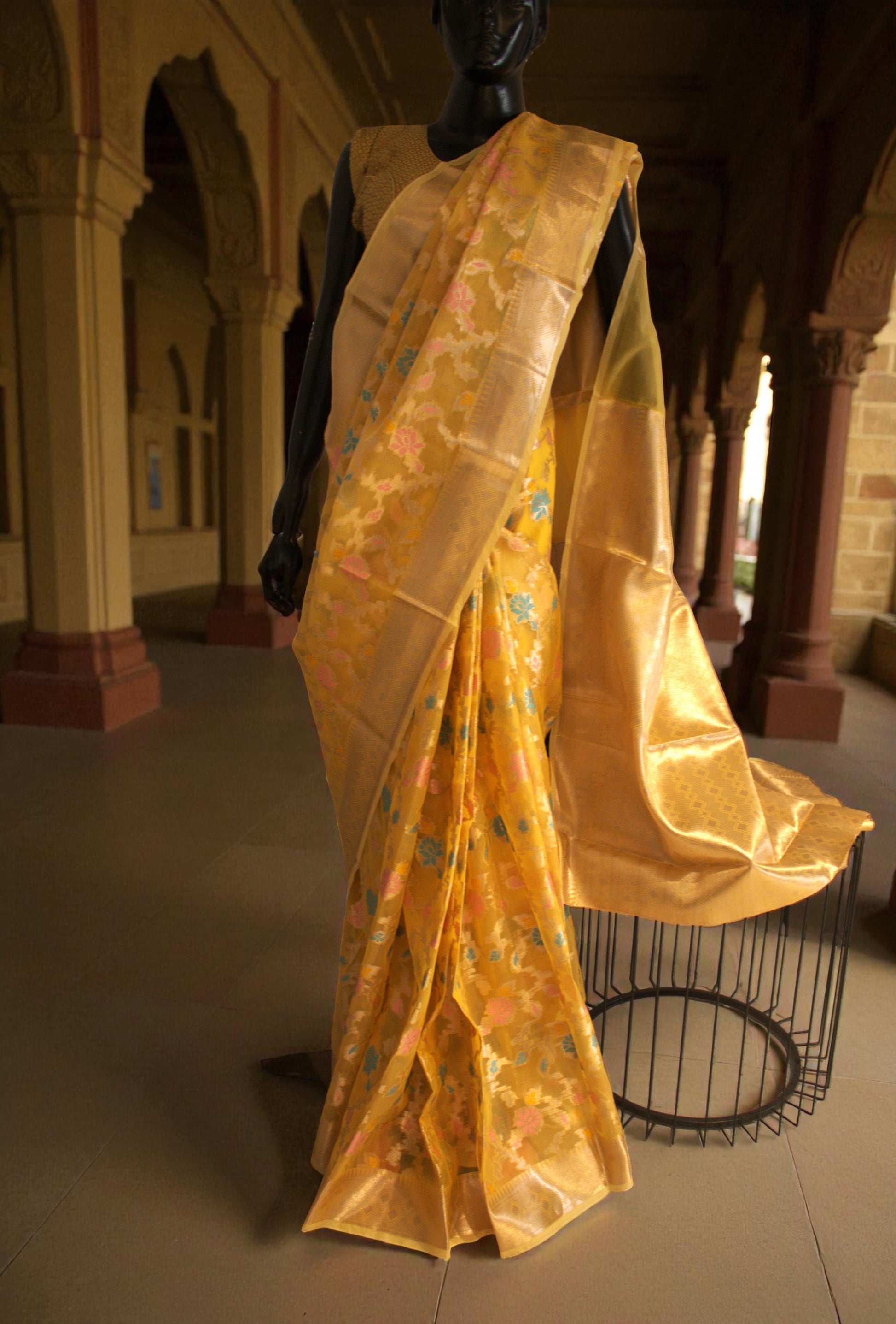 Kora Silk Benarasis are silk benarasi fabrics that are light weight and sheer with intricate zari work done all over. These sarees come with a blouse piece of 80 cm and the saree is 6.3 metres long.