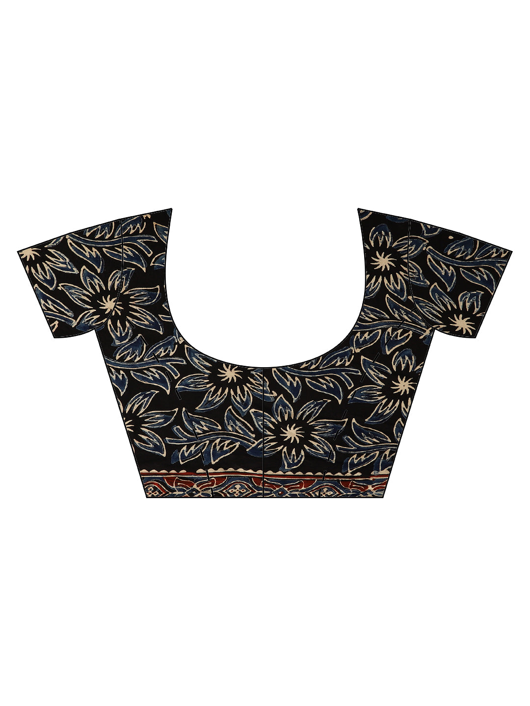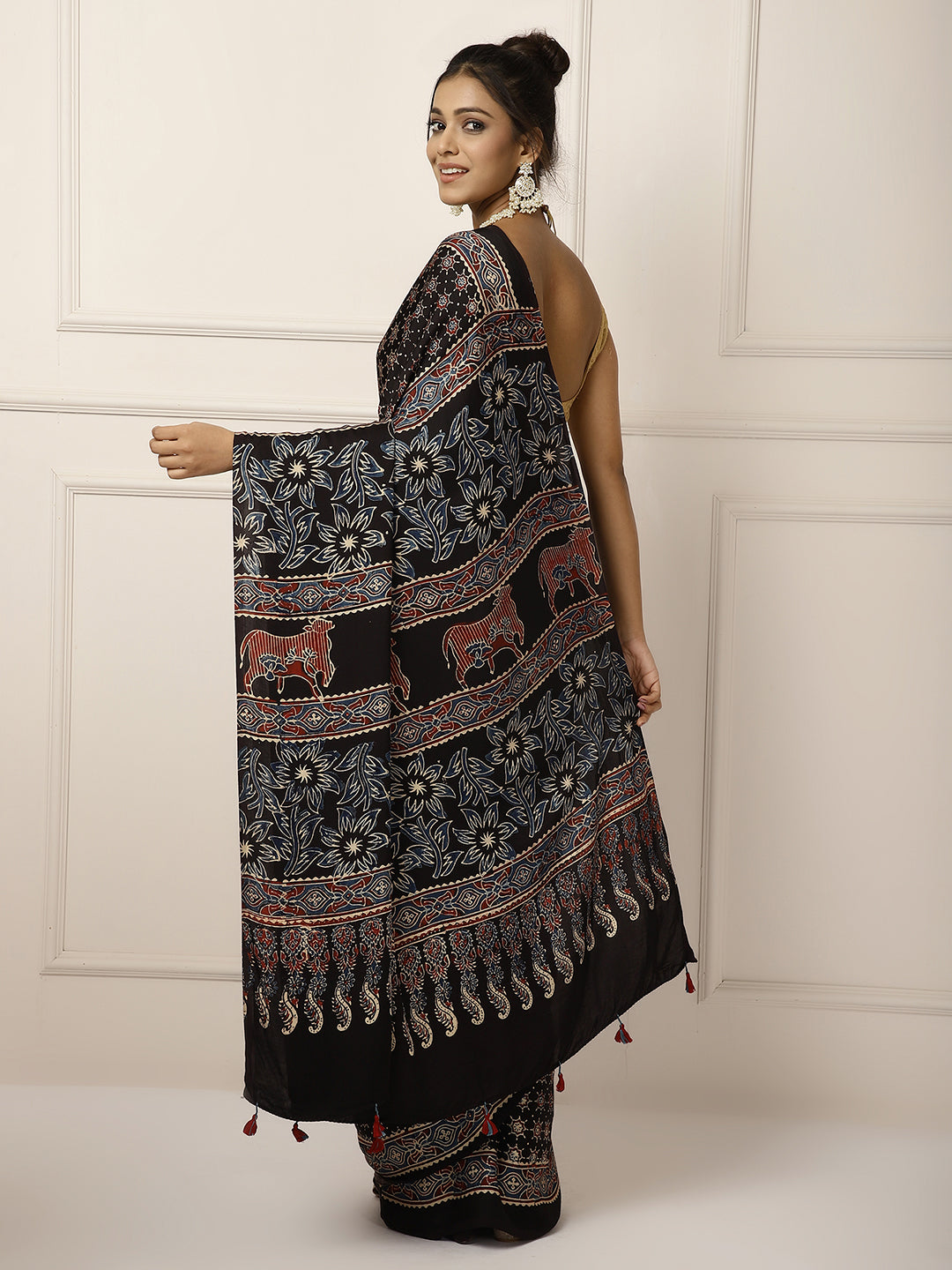 Beautiful Modal silk saree with Ajrakh handblock done on the entire body of the saree. The material is soft and drapes beautifully clinging to the body. The blouse piece is also unique. The saree length is 6.3 metres including blouse.