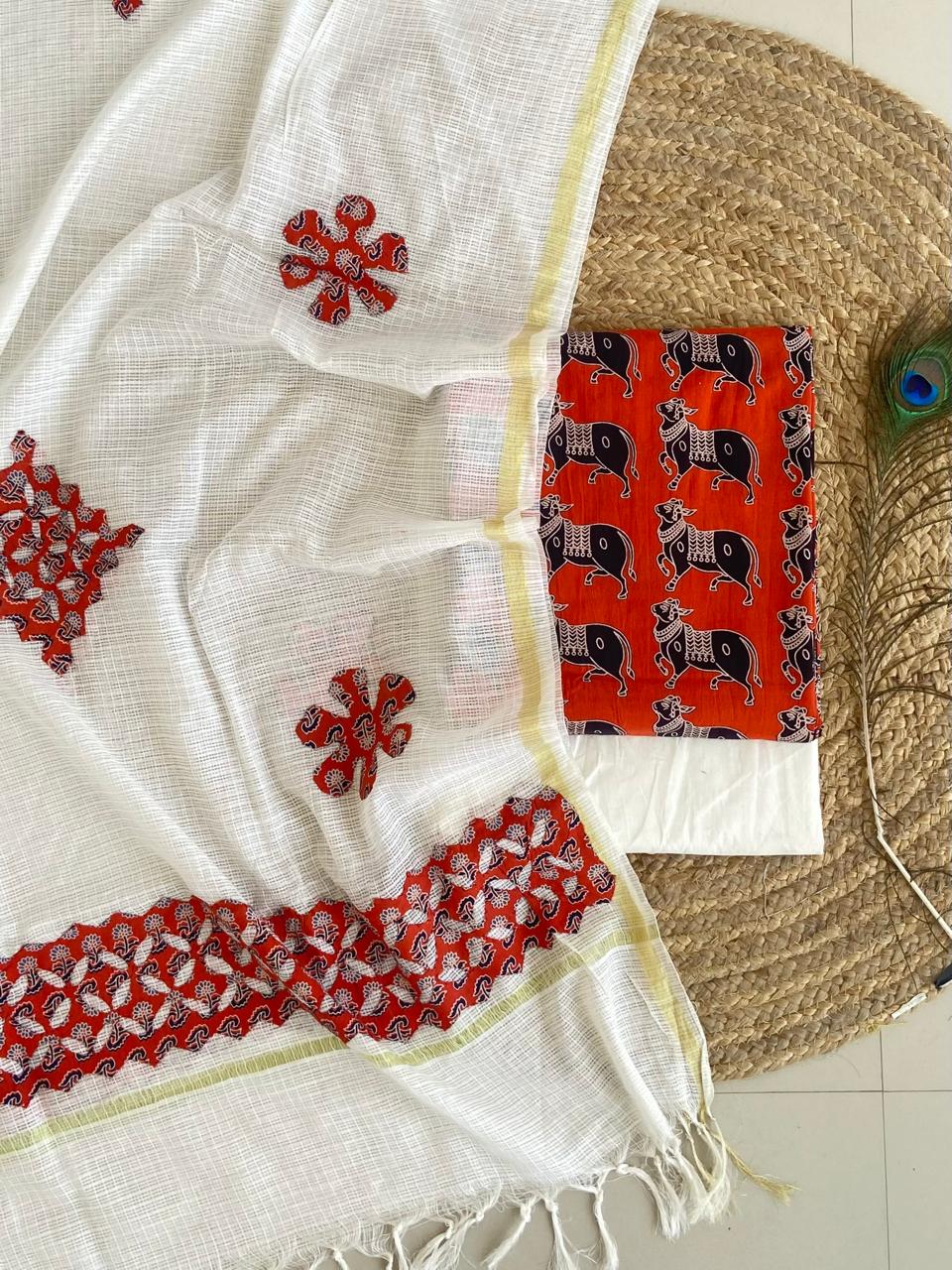 The orange goumata is a symbol of purity. The Dupatta is made of pristine kota with applique work. Pure cotton suit pieces. Top 2.5 metres, bottom 2.5 metres and Dupatta 2 metres. The applique patchwork is done by hand and therefore the dupattas look pretty. Colours may bleed as vegetable colors. Therefore, wash separately and in cold water. Dupatta has to be drycleaned.