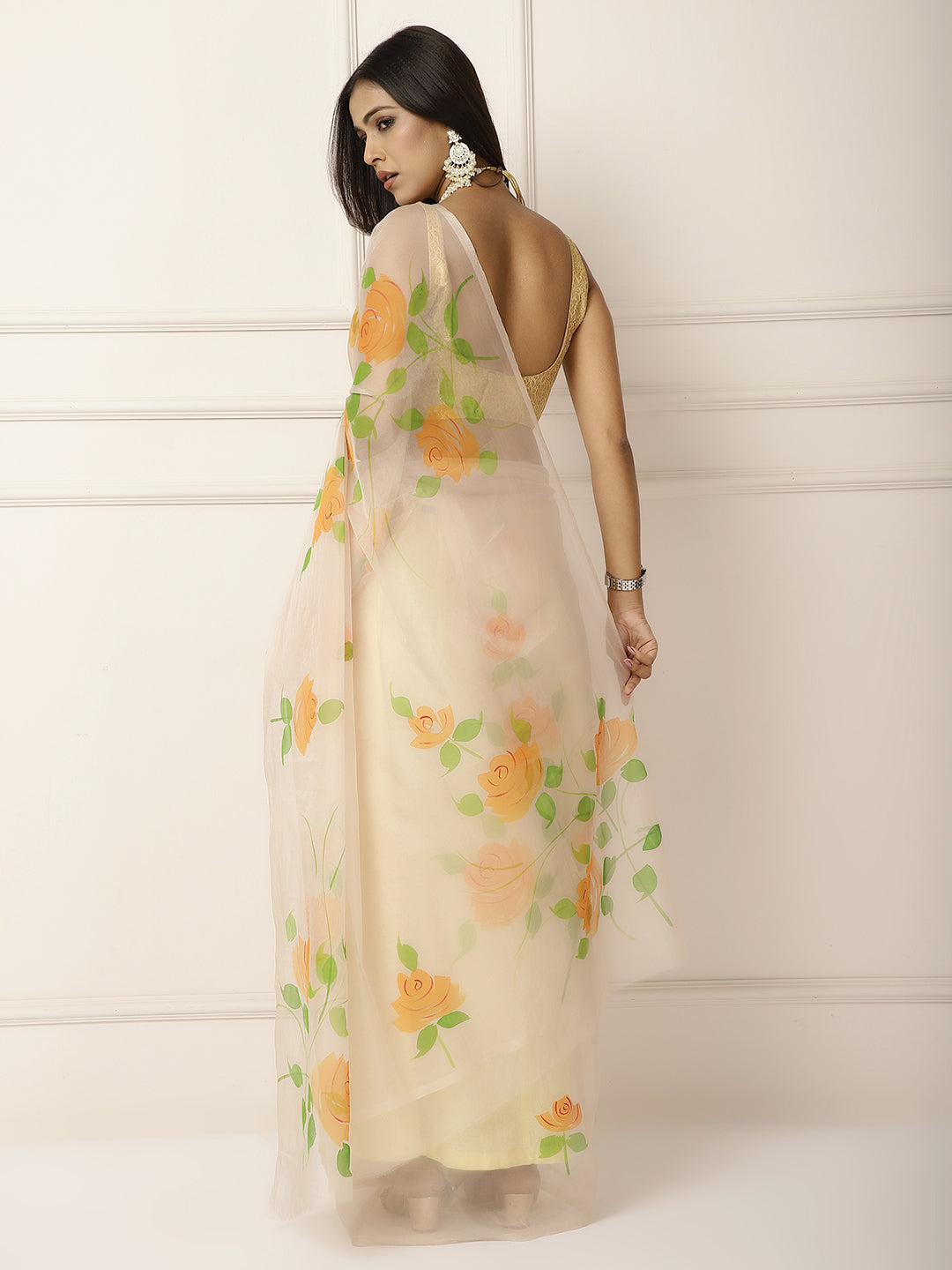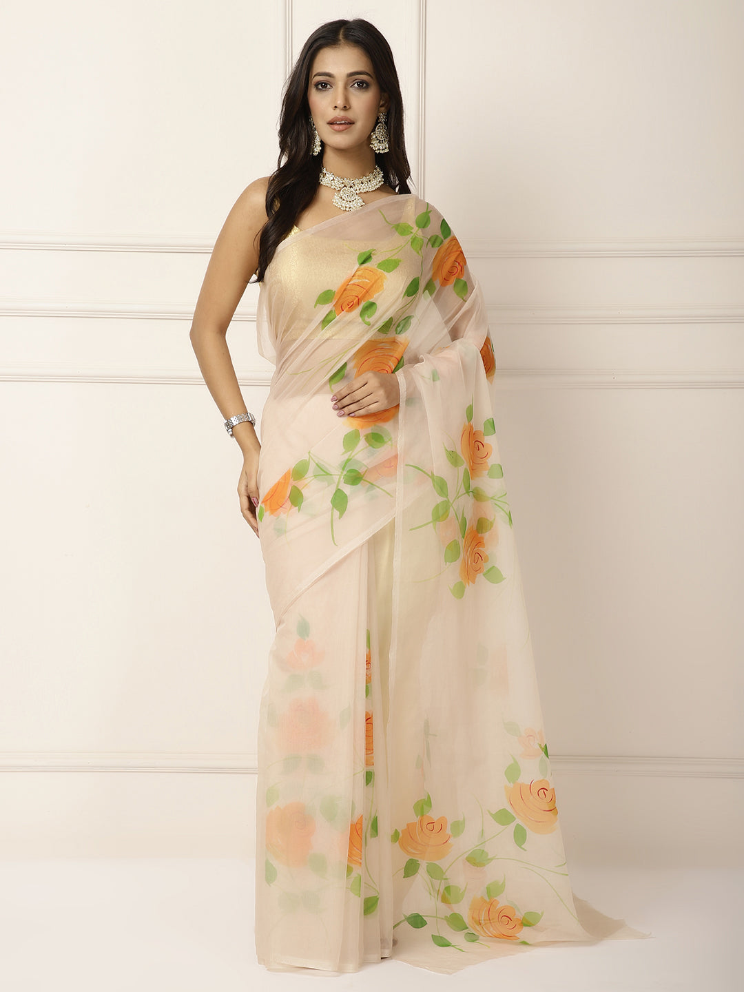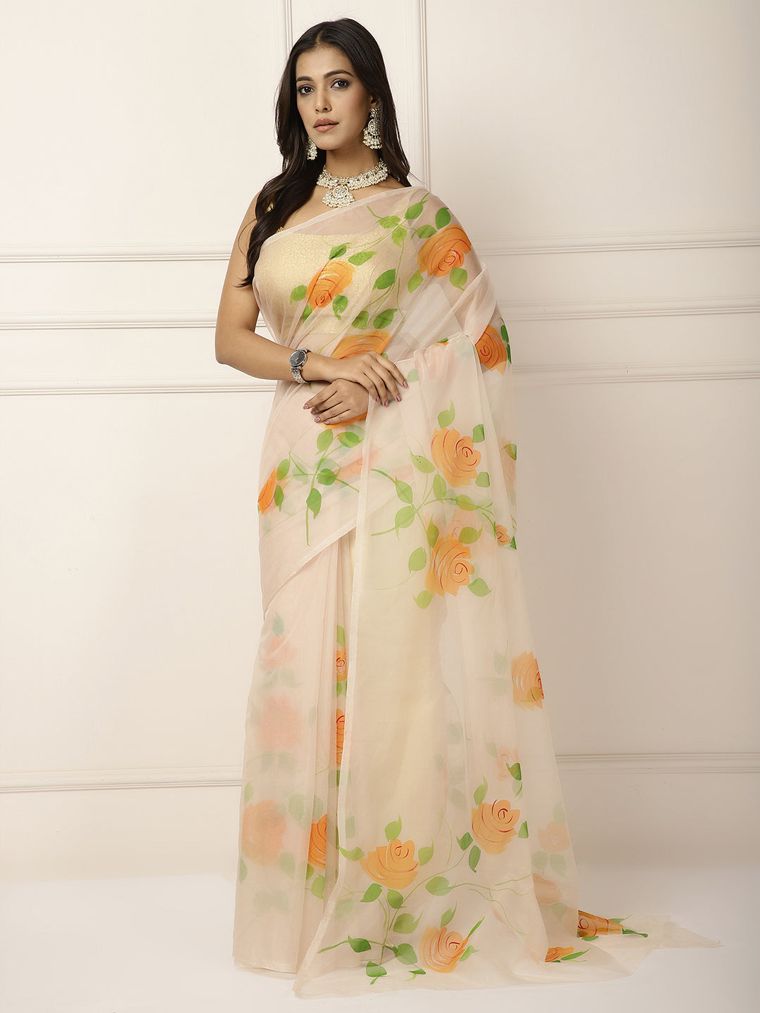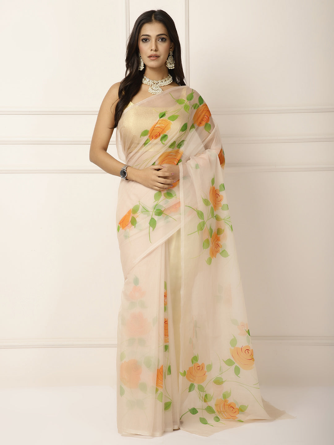 Beautiful organza saree which handpainted by our artisan. Looks beautiful in all occasions. Saree length 5.3 Metres. There is no blouse piece with this one. Pair it up with a neutral or golden blouse for a glam look!