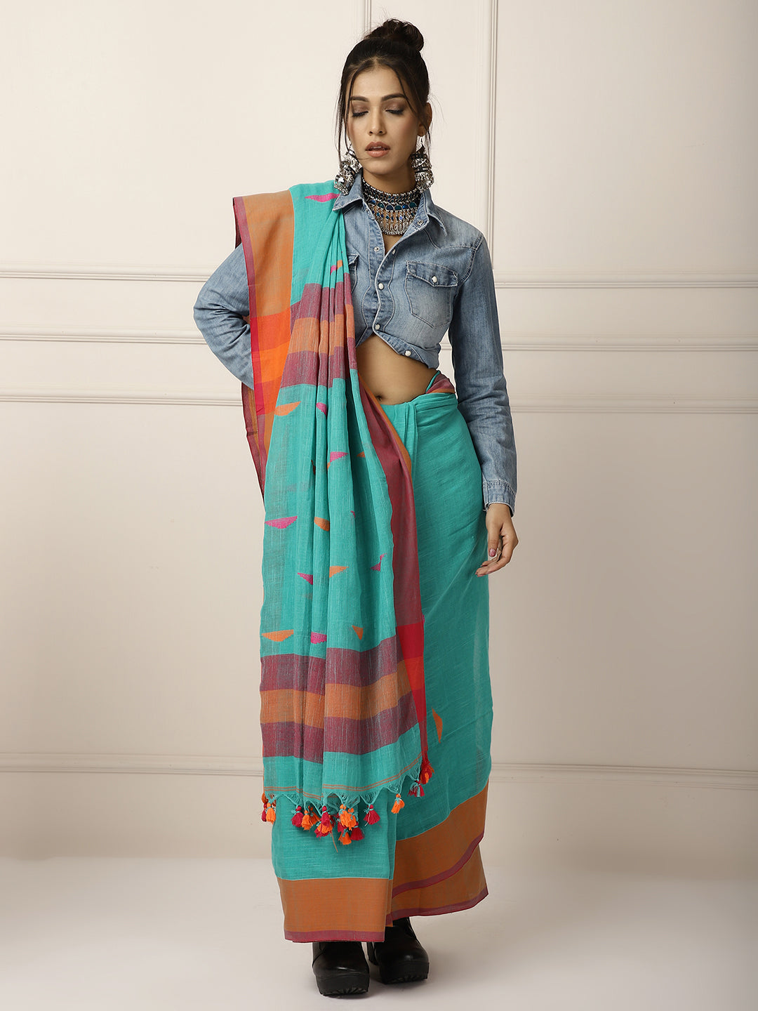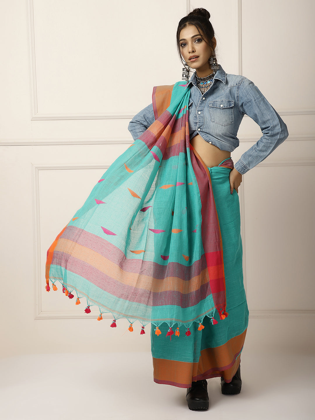 Handloom cotton woven in blue and the motifs are woven in to the saree. The khadi alternative red and orange tassels accentuates the beauty of the saree. The material is very skin friendly, soft and organic so its specially suitable for wearing all day. The saree is 6.3 meters inclusive of the blouse.