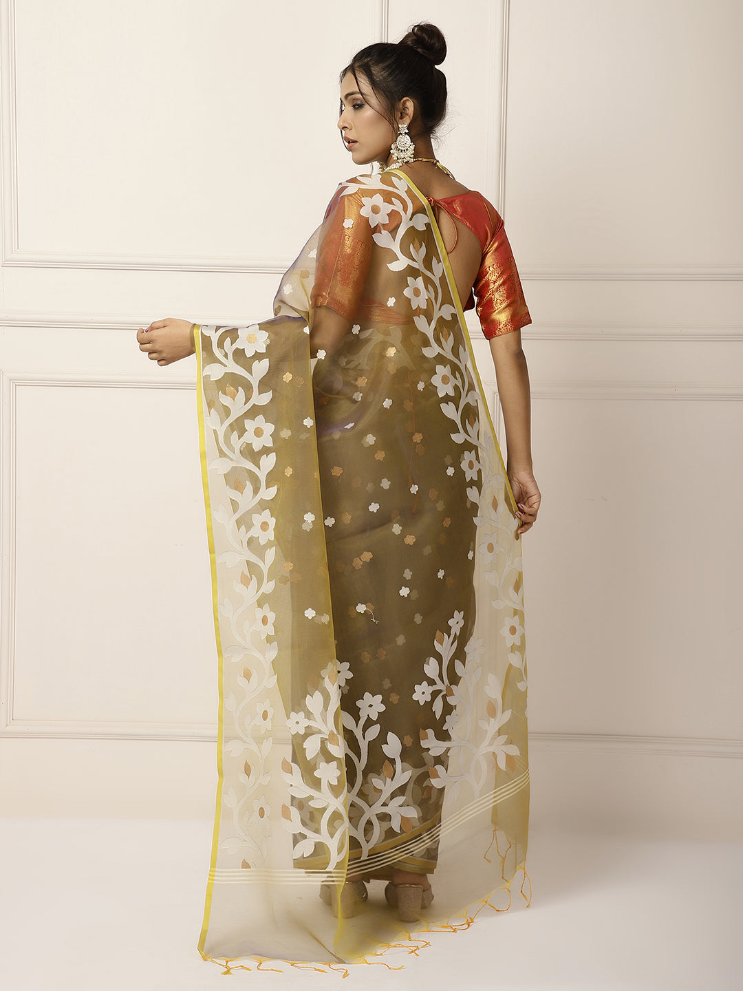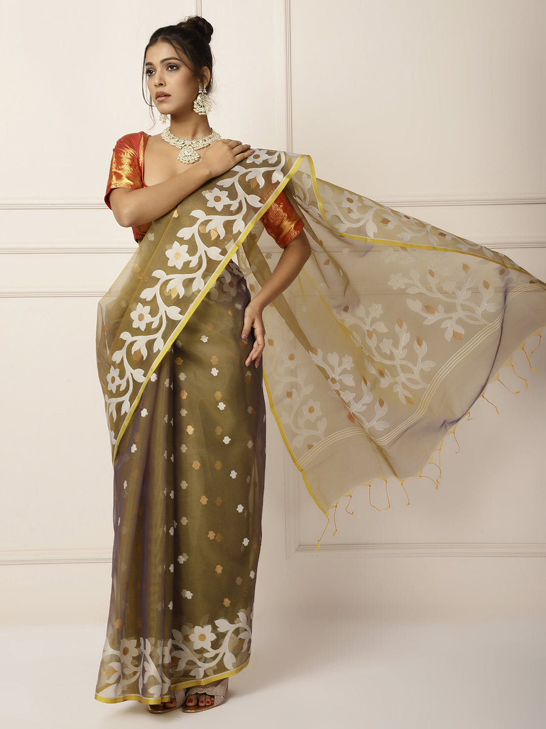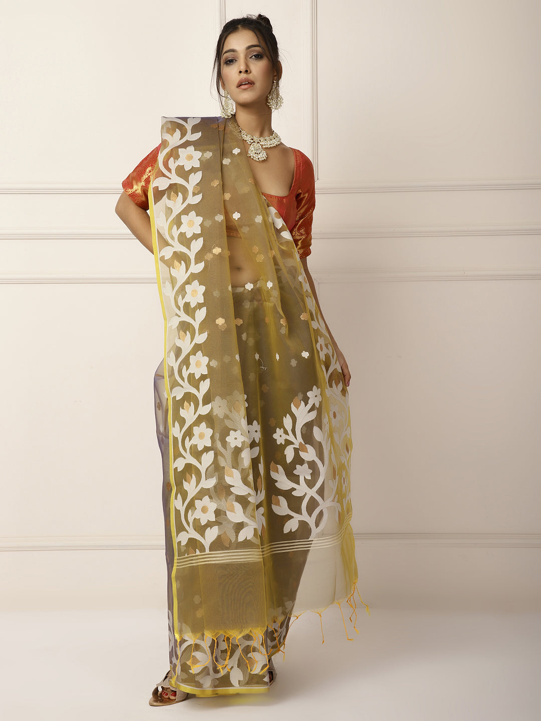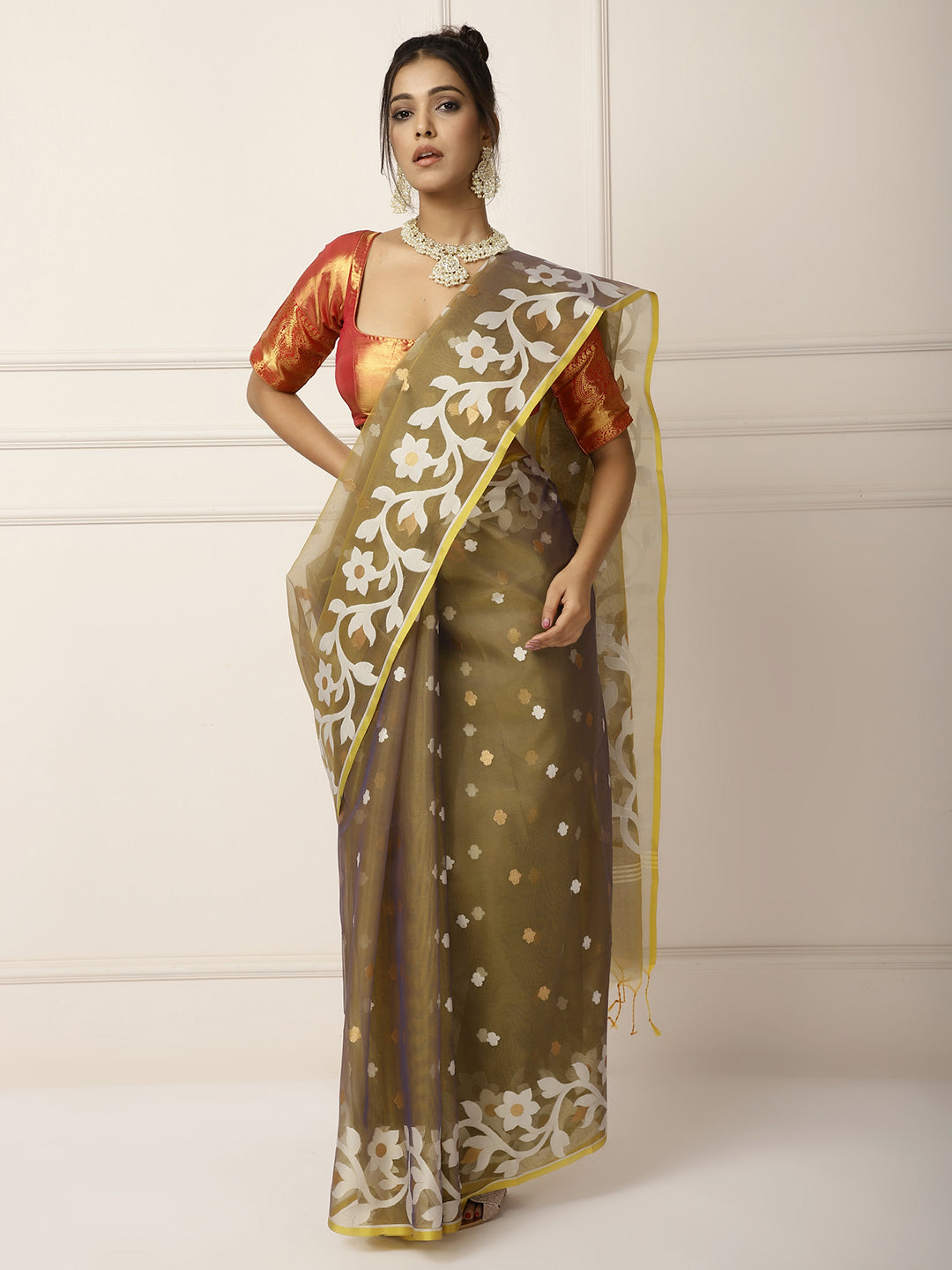 Resham Jamdani from the looms of West Bengal. The saree has woven Jamdani work on it and makes for a beautiful wear . The Jamdani is woven in silk. The Saree has a blouse piece included in it. The Saree is 6.3 metres along with blouse piece. The blouse piece is running. The blouse on the model is not indicative of the blouse piece with the saree.