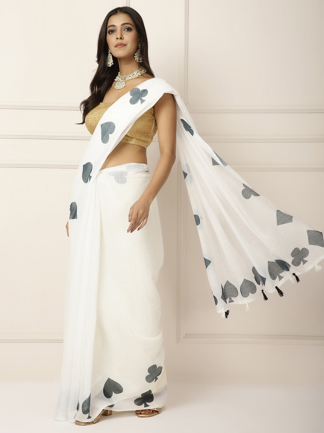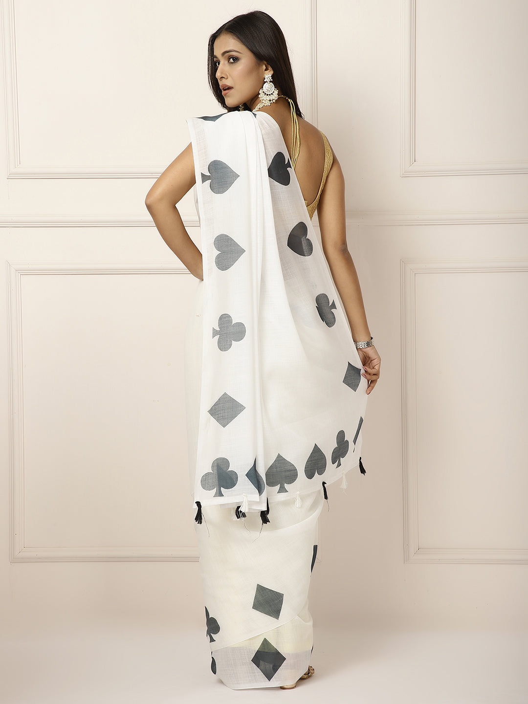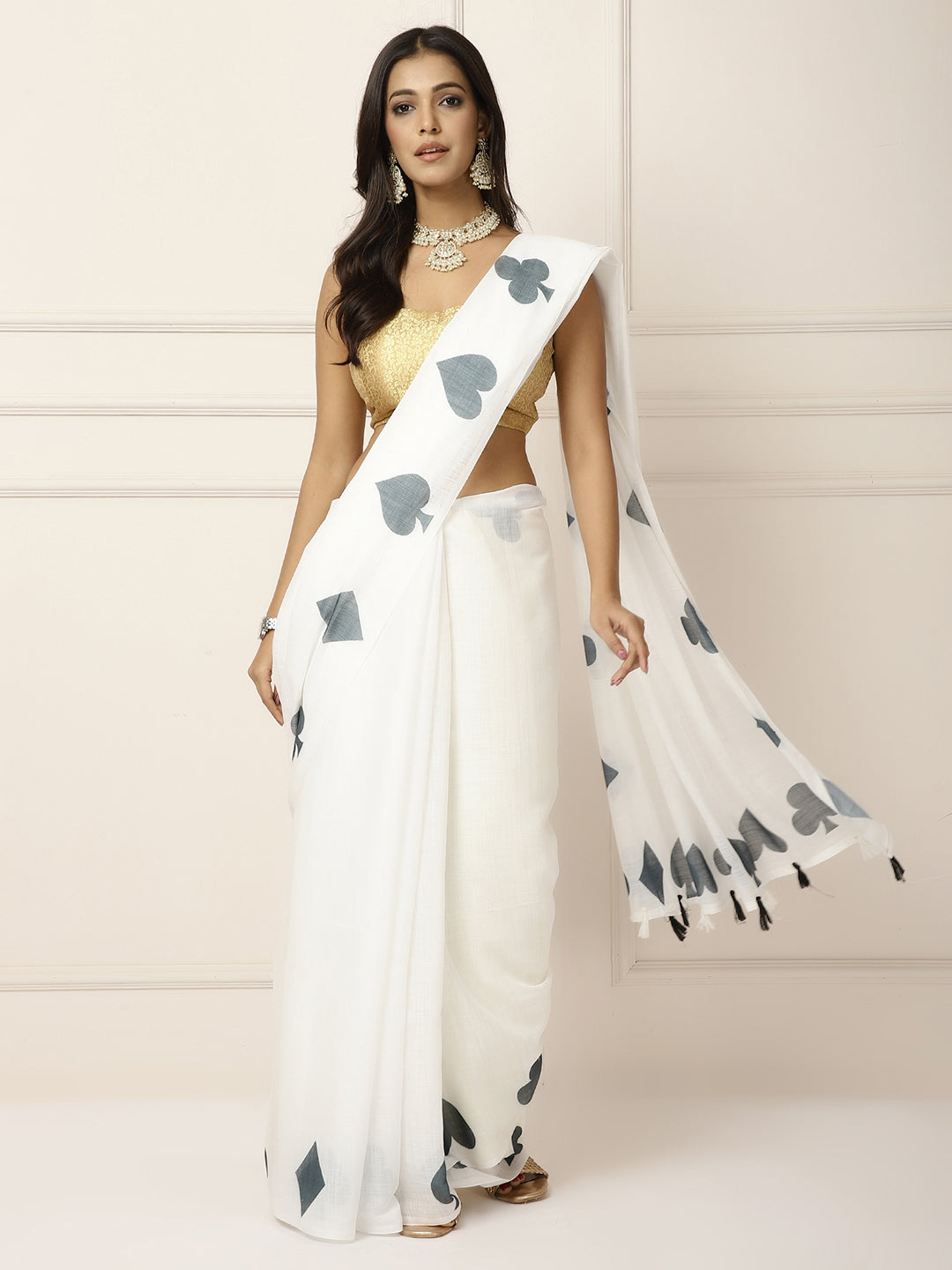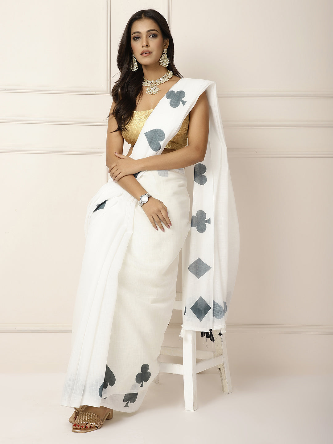 What is a saree? A pack of cards! Pristine white linen saree with spades and clubs motifs on the border. Comes with a black blouse piece. The material is linen. The length along with the blouse is 6.3 metres.